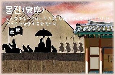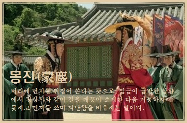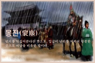 몽진(蒙塵)의 몽(蒙)도 이와 같이 '받는다', '입는다'의 뜻으로 사용된 것으로 '먼지를 뒤집어 쓴다'는 뜻이다. 몽진(蒙塵)을 꼭 임금의 피난만을 의미하는 것이 아니라 이런 일반적인 의미로도 사용할 수 있다는 뜻입니다. 임금의 피난이라는 뜻으로 사용하는 것은 전거(典據)에 기초한 비유적 표현이다.