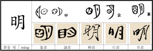 해는 낮에 만물을 보듬는 따뜻한 빛을 발산하고, 달은 밤에 어둠을 헤쳐 나갈 수 있도록 빛을 낸다. 明자는 이러한 해와 달이 합쳐져 ‘밝다’라는 뜻을 나타낸다고 한다. 즉 음과 양의 상징인 해와 달이 결합한 글자가 明자이다.