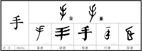 금문에서 ‘手’자는 처음에는 분명히 쫙 벌린 다섯 손가락을 그린 것임을 알 수 있다. 하지만 이런 형상은 더 이상 손의 모습이 아니다. 왜 손가락을 꽃대에 달린 잎사귀 모양으로 그렸을까. 왜 결정적인 기능을 가진 엄지손가락을 볼 수 없을까.[1]