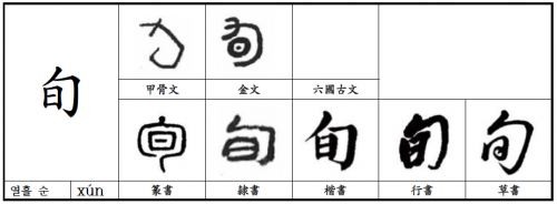 설문해자에서는 '旬은 두루 미치는 것이다. 열흘이 旬이다. 포와 日을 따른다. '고 되어있다. 갑골문과 금문에서는 나중에 日이 덧붙여졌는데, 벌레의 모습을 빌어 시간의 길이를 나타내고 있다. [2]