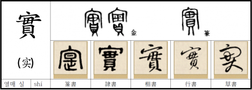 <설문해자> : “실(實), 부유한 것이다.” 금문의 ‘실(實)’자는 집(宀)과 밭(田)과 조개(貝)를 따른다. 집 안에 밭과 조개가 있으니 부유함을 나타낸다. 소전에 ‘실’자는 ‘집(宀)’과 ‘관(贯)’을 따르며, 여기서 ‘관’은 화폐를 가리킨다. 그러므로 ‘풍족하다(富足)’의 뜻도 있다. 그래서 ‘실’의 본래 뜻은 ‘풍족하다(富足)’, ‘유복하다(殷实)’이다. 또한 ‘재산(财富)’, ‘재물(财物)’을 가리킨다. 뜻이 파생되어 ‘충만하다(充满)’를 가리키며, ‘공허하다(空虚)’와 상대적이다. 또한 ‘진실로(真实)’를 가리키며, ‘허위의(虚假)’와 상대적이다.