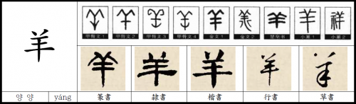羊이라는 글자는 ‘그림’적인 표현이 가장 두드러지는 글자 중 하나이다. 즉, 그 형체를 가장 사실적으로 표현한 글자 중 하나라는 것이다. 양의 모양은 장식미적인 측면에서도 칭송받았다. 또한 제사의식에도 쓰였고, 양털과 가죽으로 옷을 만들었으며, 양고기는 맛이 좋은 음식으로 여겨졌다. 또한 그 순한 성격 탓에 사람을 공격하거나 위협하는 동물도 아니었다. 즉, 양은 다방면에서 사람들에게 좋게 받아들여진 것이다. 그래서 羊과 결합하는 글자는 좋은 의미를 가진 것이 많다. 善(좋을 선), 美(아름다울 미)등이 그것이다.[1]