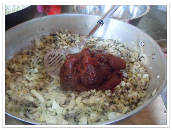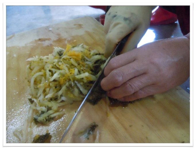 배추를 송송 썰고 양념을 준비하여 메밀전병 속을 만드시네요.