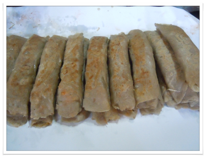 준비한 속을 넣어 메밀부침을 돌돌 말아서 메밀전병을 만듭니다~