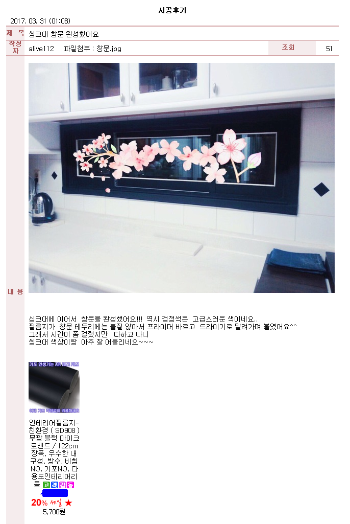 유리창시트지- 주방 창문틀을 무광블랙인테리어필름지로 시크하고 멋스럽게 시공한 후기 작성자포토세상|작성시간17.04.03|조회수86 목록 댓글 0 글자크기 작게가 글자크기 크게가 장덕수 시트지 연구소 http://www.jdsoo.co.kr 에서 더 많은 시공 후기들을 보실 수 있습니다 다음검색 현재 게시글 추가 기능 열기 북마크 공유하기 신고 센터로 신고 댓글 댓글 0 댓글쓰기 댓글 리스트