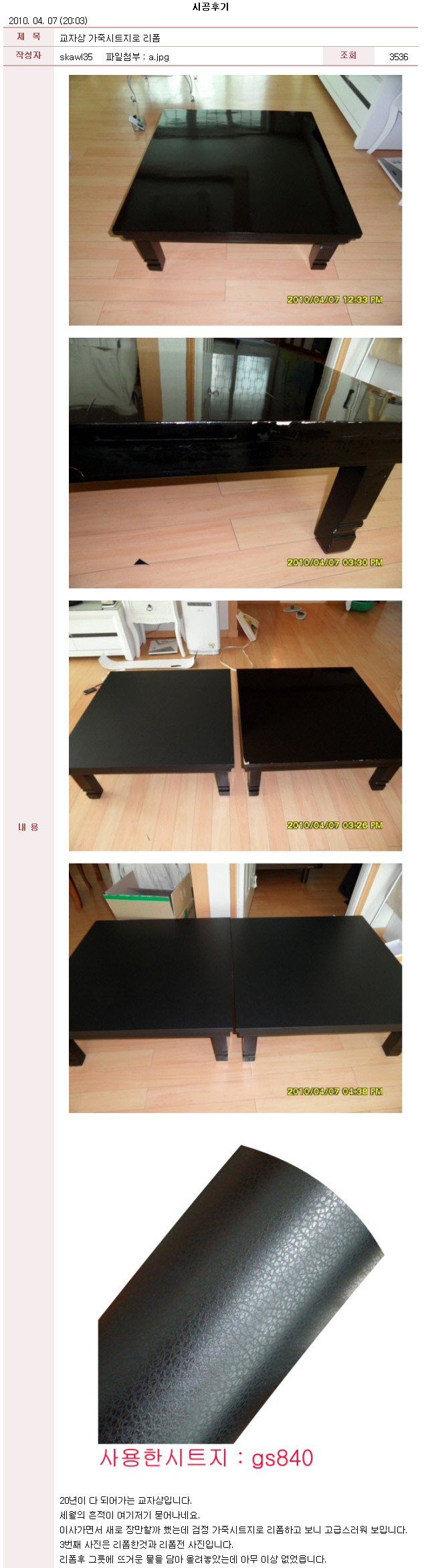 가죽시트지-교자상 가죽시트지로 리폼 작성자포토세상|작성시간15.02.04|조회수280 목록 댓글 0 글자크기 작게가 글자크기 크게가 장덕수 시트지 연구소 쇼핑몰 www.jdsoo.co.kr 에서 구매하실수 있습니다 다음검색 현재 게시글 추가 기능 열기 북마크 공유하기 신고 센터로 신고 댓글 댓글 0 댓글쓰기 댓글 리스트