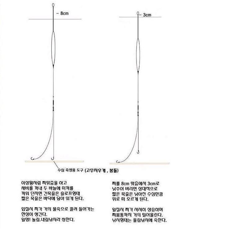 바닥낚시는 채비의 안착이 기본이고, 10cm전후의 목줄로 짧은 유격을 두지만,