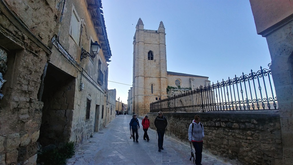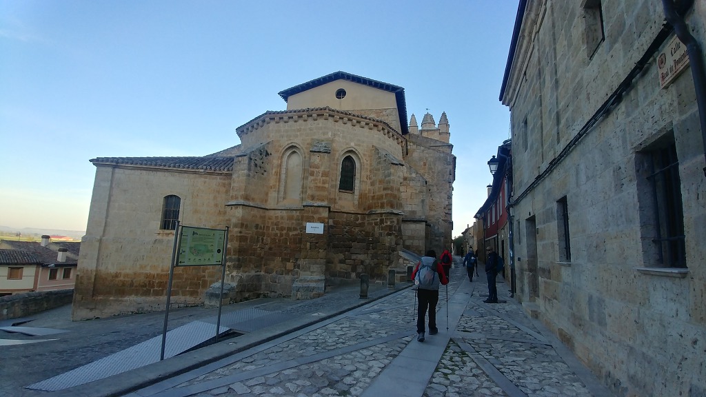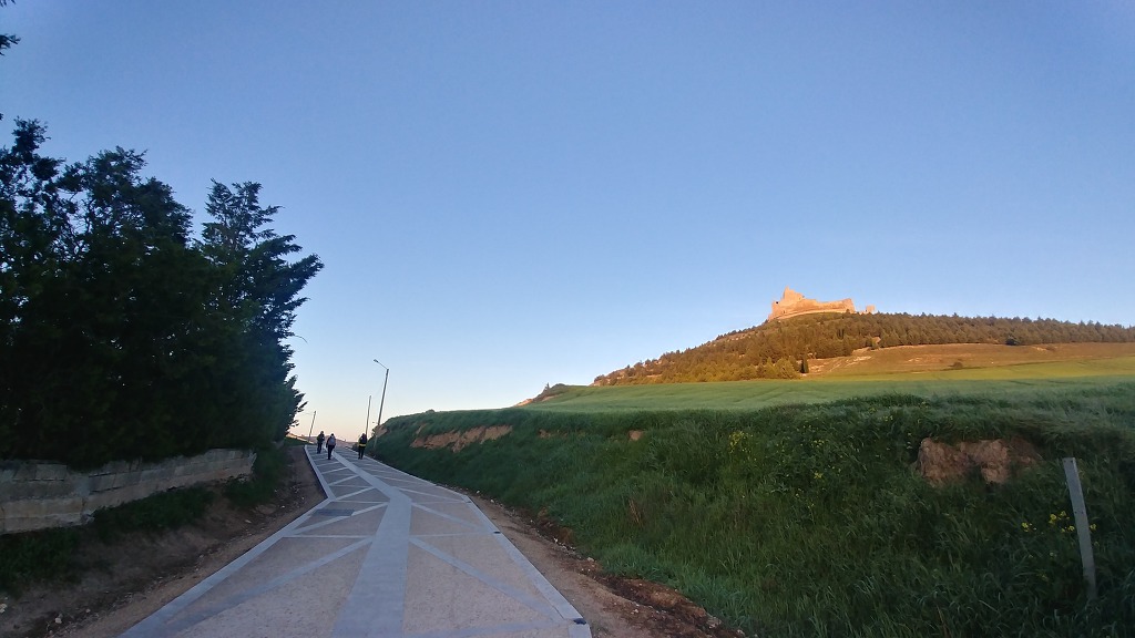 카스트로 해리스의 오리온 알베르게 떠나 (아침 햇살에 빛나는 산꼭대기의 성곽이 보인다)
