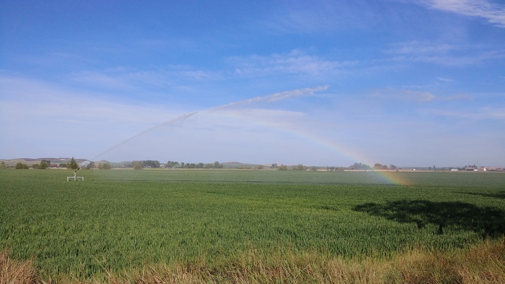 스프링쿨러가 돌아가는 농경지 (물줄기에 무지개가 비춰진다)