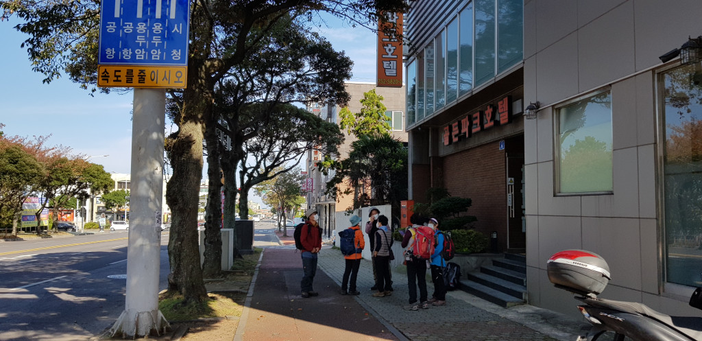 제주시내 숙소 버스터미널 옆 '골든파크호텔' 앞에서 택시를 기다리며..