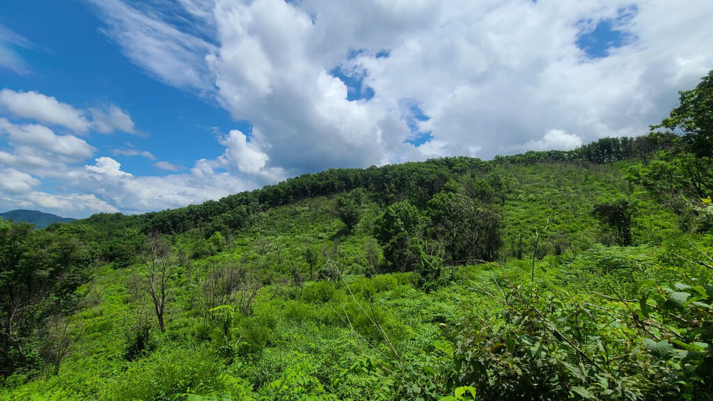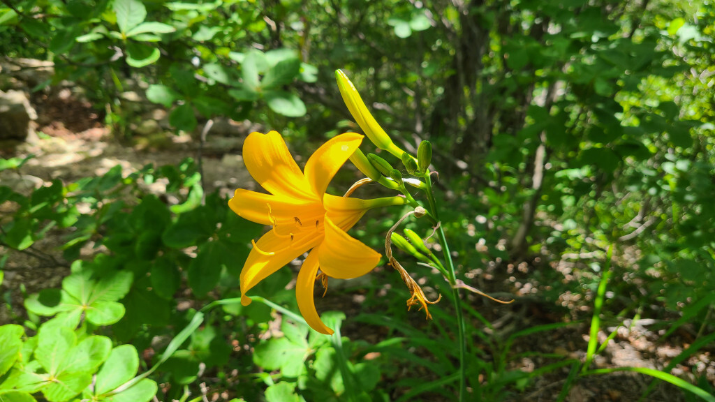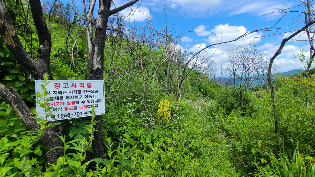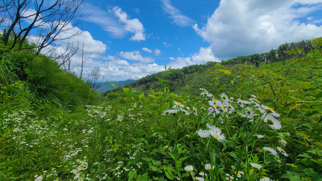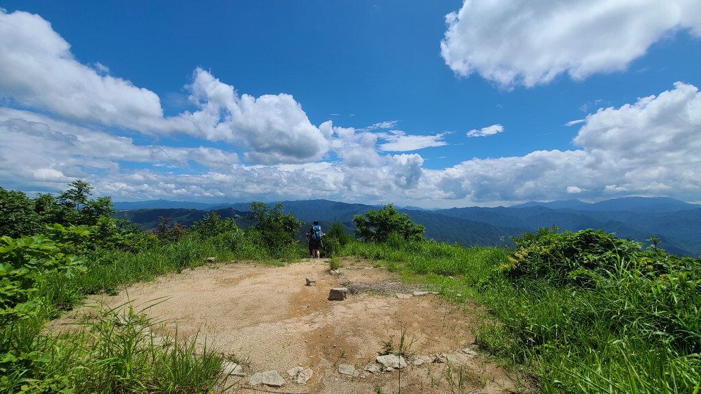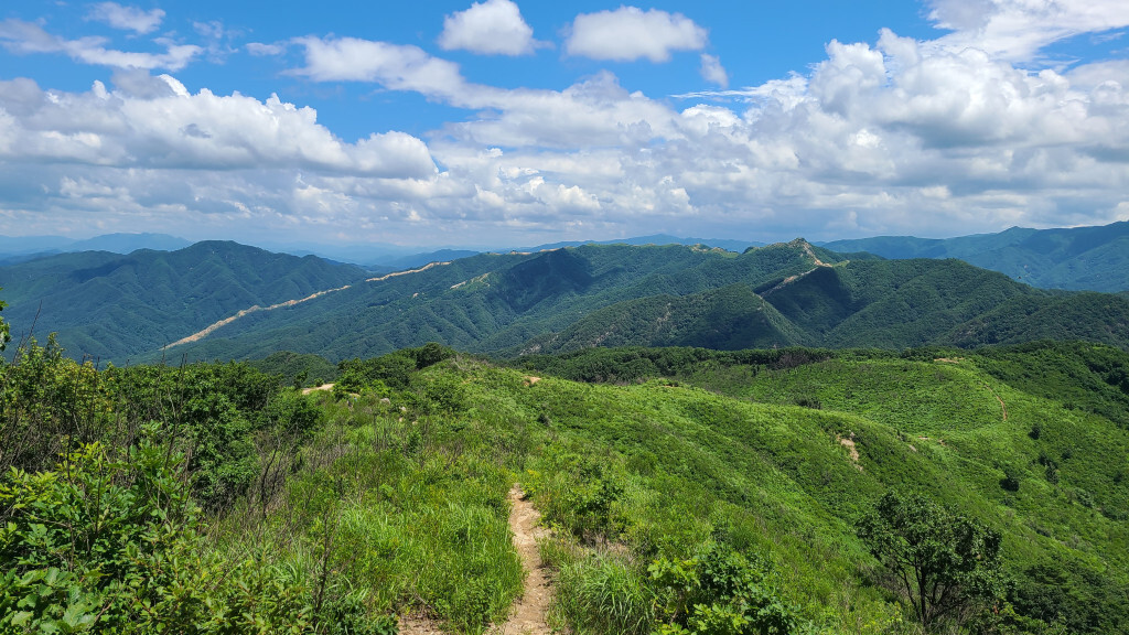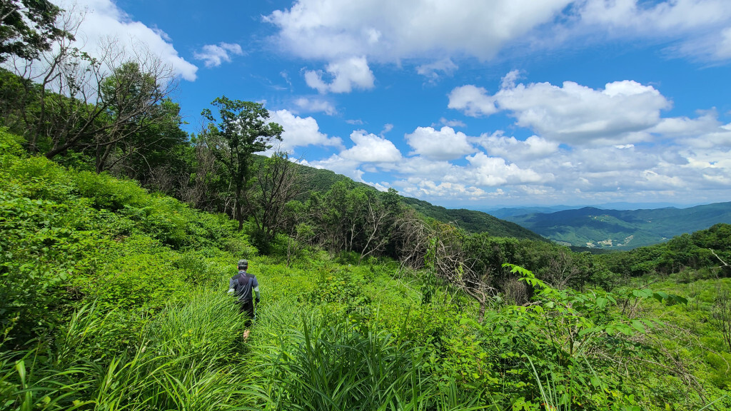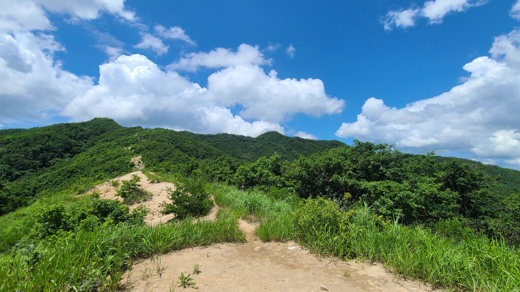 - 억새밭 길로(관목과 억새가 있는 뙤약볕길. 고지대라 그렇게 덥진 않다)