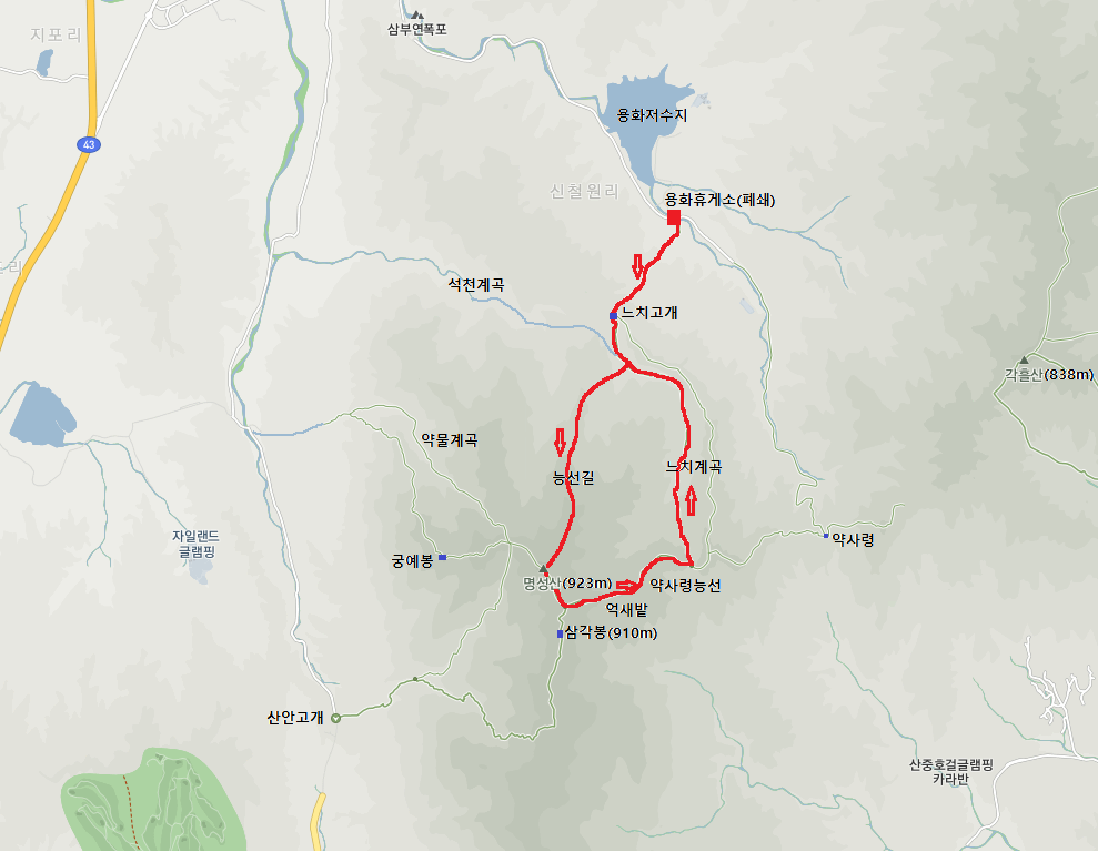 * 산행코스 : 용화 저수지(폐쇄된 용화 휴게소 앞) - 느치 고개 - 느치 계곡 - 명성산 정상 - 약사령 능선 - 느치 계곡 - 느치 고개 - 용화동 (원점회귀)
