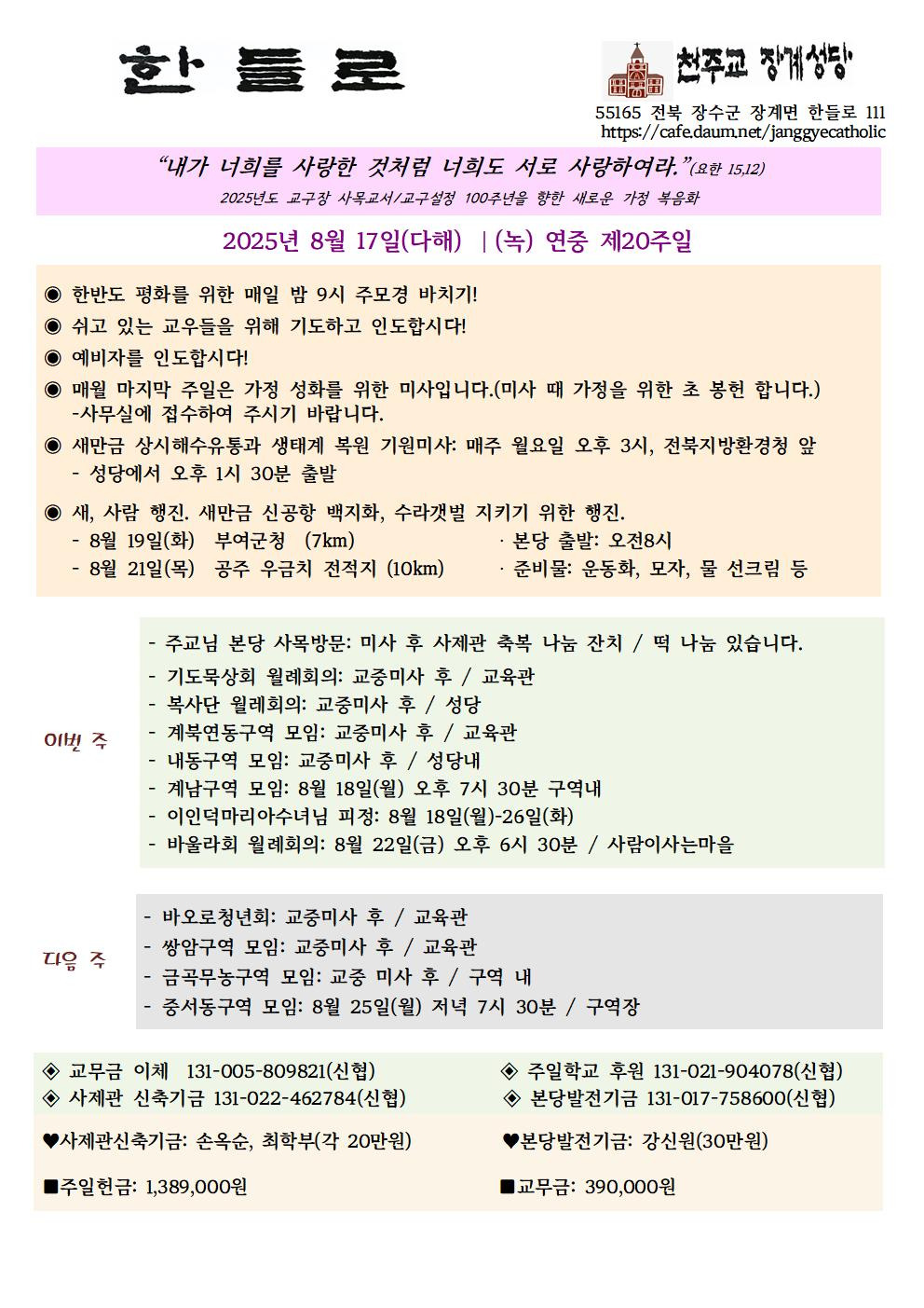 장계성당 소식지[연중 제20주일] 작성자최사비나|작성시간25.08.17|조회수27 목록 댓글 0 글자크기 작게가 글자크기 크게가 다음검색 현재 게시글 추가 기능 열기 북마크 공유하기 신고 센터로 신고 댓글 댓글 0 댓글쓰기 답글쓰기 댓글 리스트