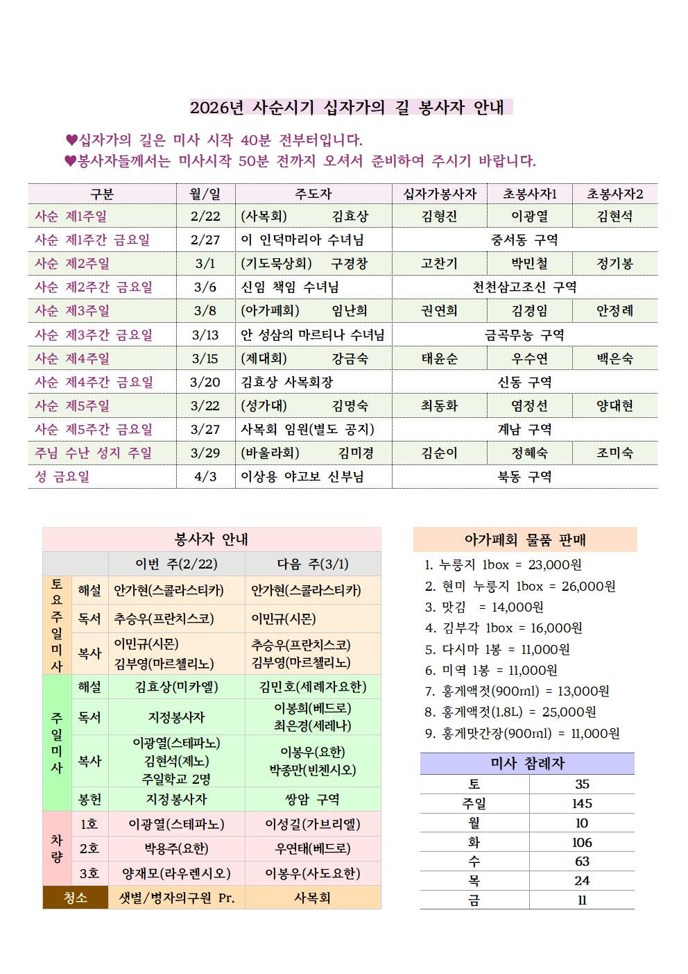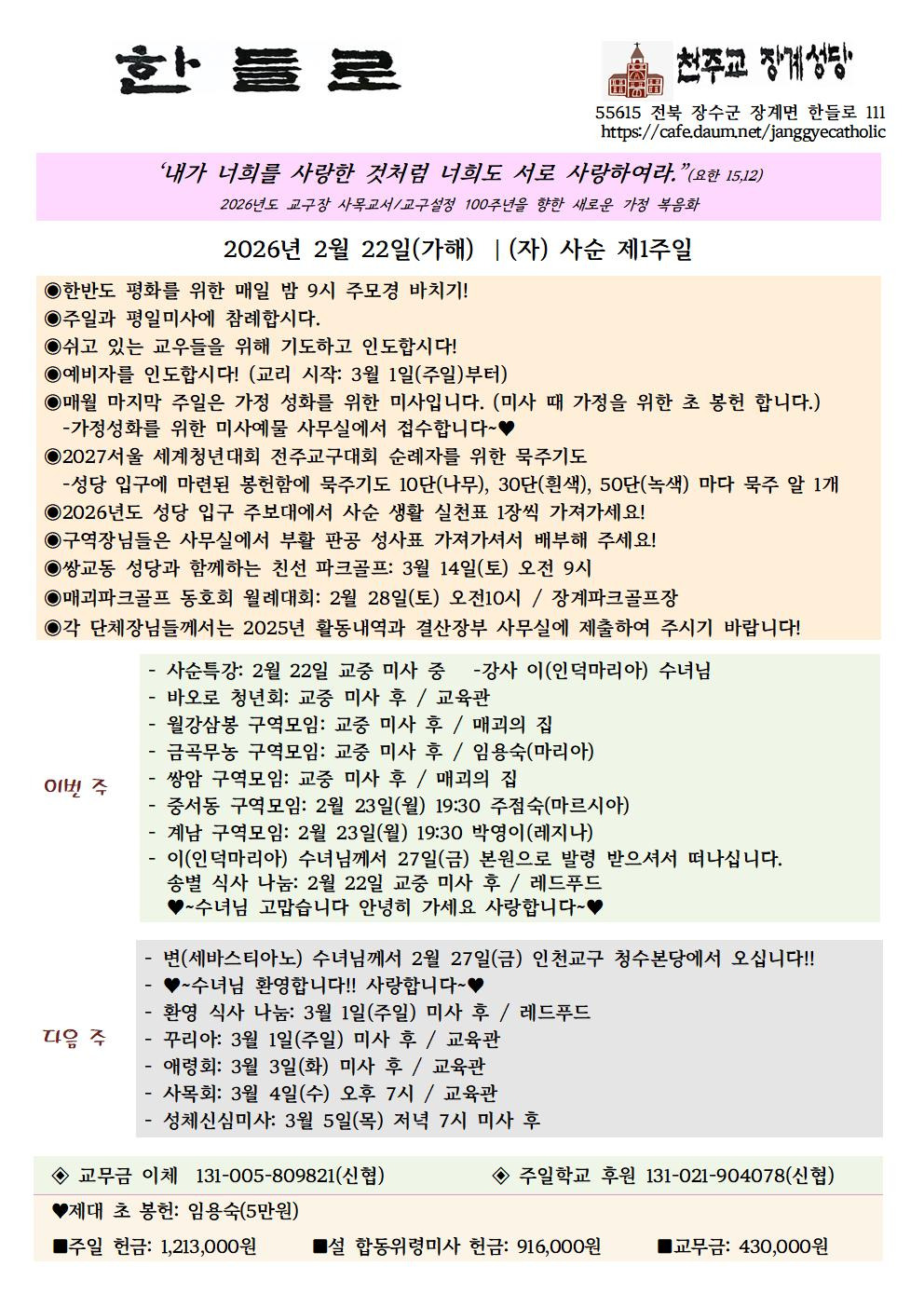 장계성당 소식지[사순 제1주일] 작성자최사비나|작성시간26.02.21|조회수33 목록 댓글 0 글자크기 작게가 글자크기 크게가 다음검색 현재 게시글 추가 기능 열기 북마크 공유하기 신고 센터로 신고 댓글 댓글 0 댓글쓰기 답글쓰기 댓글 리스트
