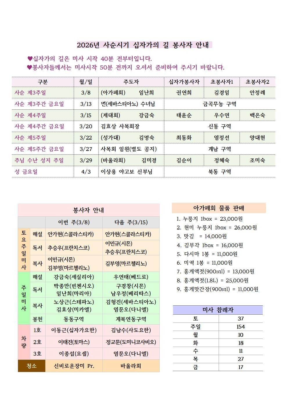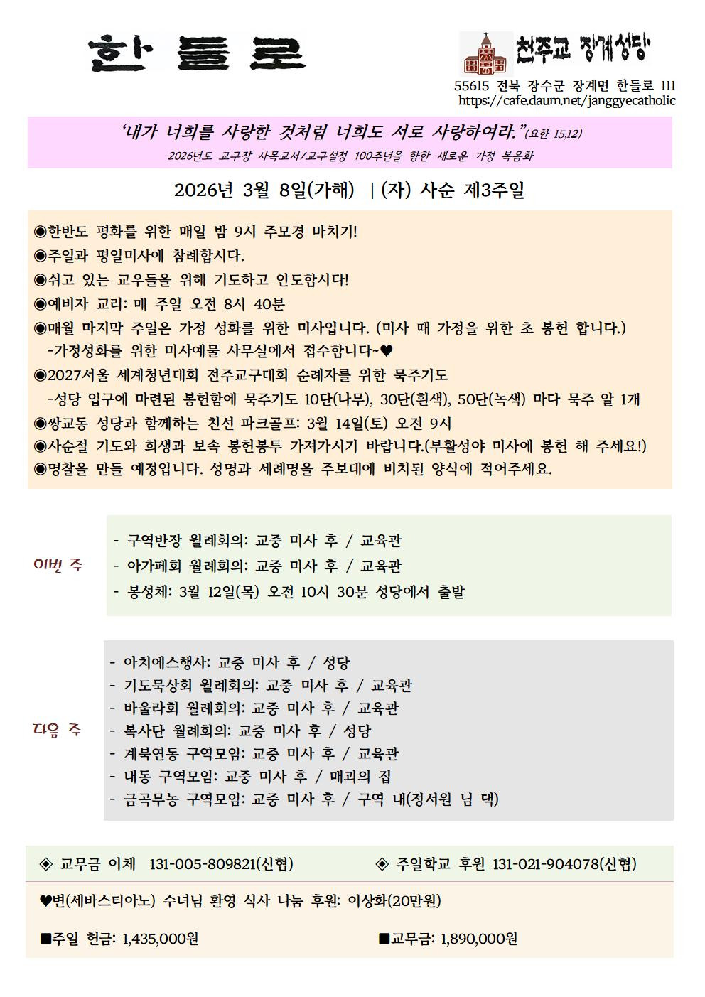 장계성당 소식지[사순 제3주일] 작성자최사비나|작성시간26.03.06|조회수33 목록 댓글 0 글자크기 작게가 글자크기 크게가 다음검색 현재 게시글 추가 기능 열기 북마크 공유하기 신고 센터로 신고 댓글 댓글 0 댓글쓰기 답글쓰기 댓글 리스트