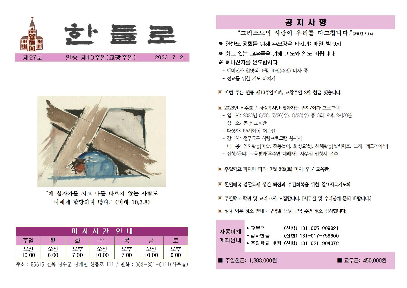 장계성당 소식지[연중 제13주일] 작성자장계 사무장(요한)|작성시간23.07.01|조회수20 목록 댓글 0 글자크기 작게가 글자크기 크게가 다음검색 현재 게시글 추가 기능 열기 북마크 공유하기 신고 센터로 신고 댓글 댓글 0 댓글쓰기 답글쓰기 댓글 리스트