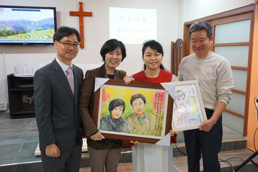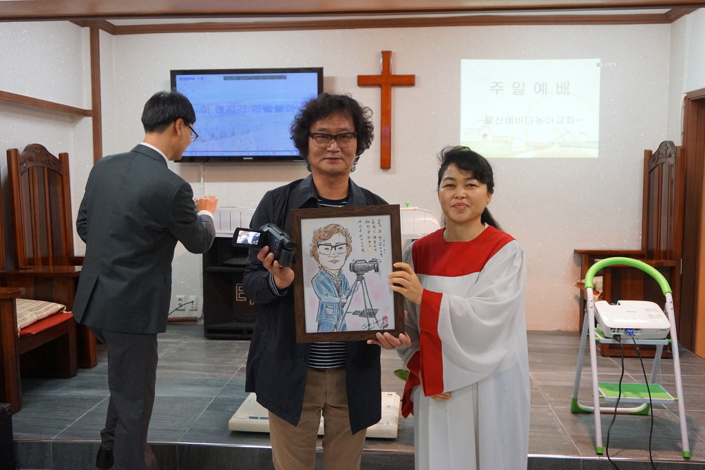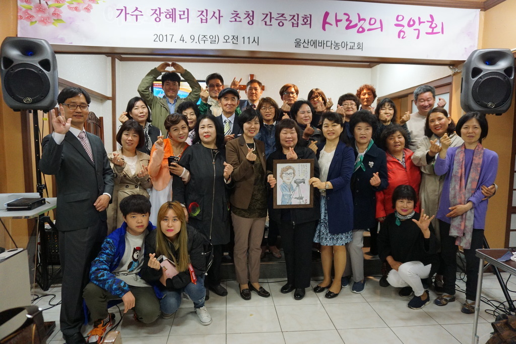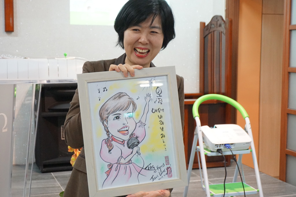 장 집사는 ‘예수가 좋다오’ ‘나의 남은 생애는’을 들려줬고 마지막으로 대중가수 시절 불렀던 ‘내게 남은 사랑을 드릴게요’를 끝으로 마이크를 내려놓았다. 성도들은 뜨거운 박수로 화답했다. 축도로 예배를 마치기 직전 선물증정 시간을 가졌다. 그것은 변애경 사모가 이번 집회 일정이 잡힌 소식을 듣고 기도하면서 정성들여 손수 그린 그림이었다. 장혜리 집사의 캐리커처 한 점과 장혜리 고경훈 부부의 수채화 한 점이었는데 예상외의 선물에 두 사람은 기쁨을 감추지 못했다. 선물 받은 그림을 들고 기념사진을 찍은 장 집사는 모든 성도들과 함께 일일이 즐거운 기념촬영을 이어갔다.