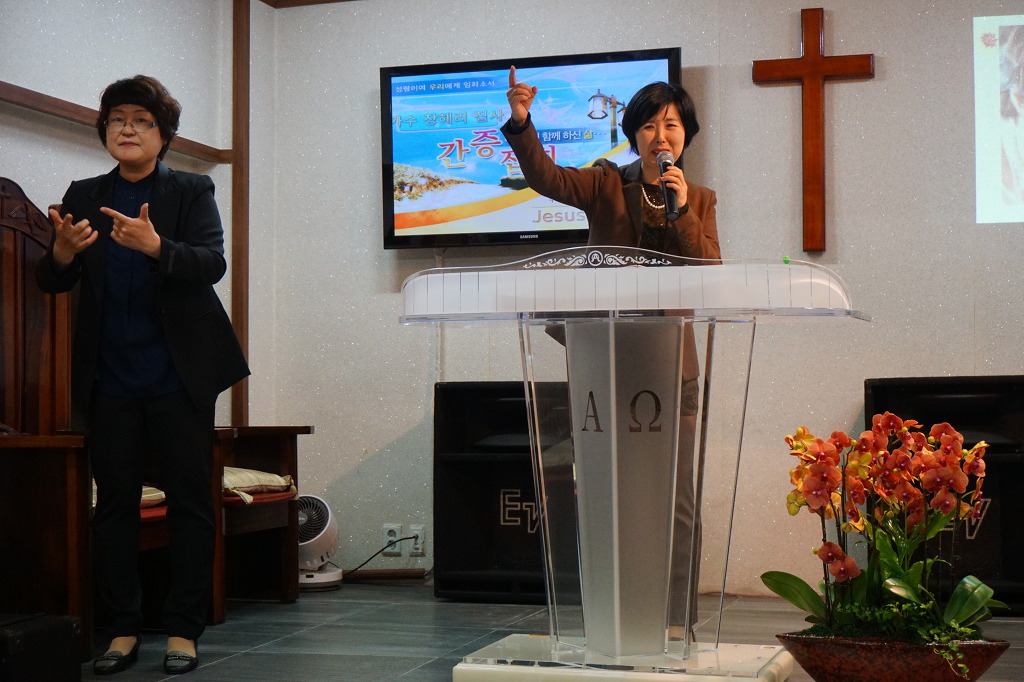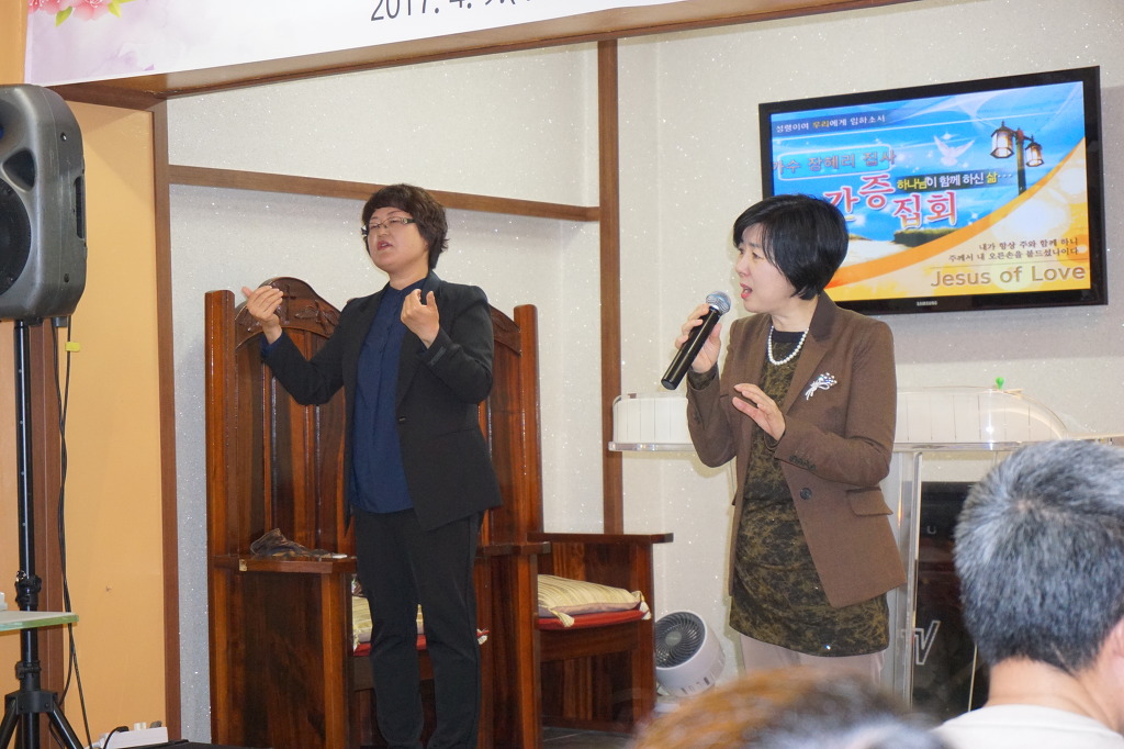 찬양하는 장혜리 집사, 수화통역 이애란 집사