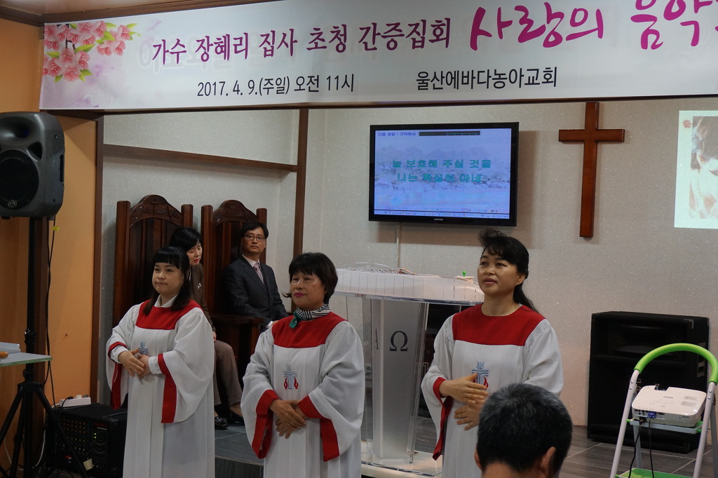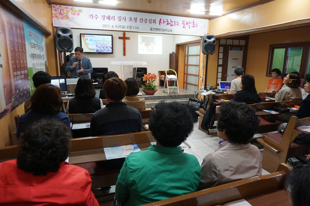 ‘오직 예수만 바라보자’는 표어로 믿음의 경주를 하는 울산에바다농아교회에 4월 9일 주일을 맞아 천상의 소리꾼 찬양사역자 장혜리 집사가 나타났다. 장혜리 집사 내외는 박종화 목사가 인도하는 울산에바다농아교회의 주일예배를 위해 예배당에 들어섰다. 장 집사와 동행한 남편 고경훈 집사가 손수 운전해온 차량에는 마이크를 비롯한 음향장비들이 들어있고, 고 집사는 항상 집회보다 이른 시간에 도착해 아내를 위해 미리 준비를 마친다.