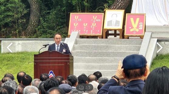 서붕 박병배 선생의 동상 제막식에서 서붕 선생의 장손인 학교법인 돈운학원 박영철 이사장이 감사의 인사를 하고 있다. 사진=이병수 기자