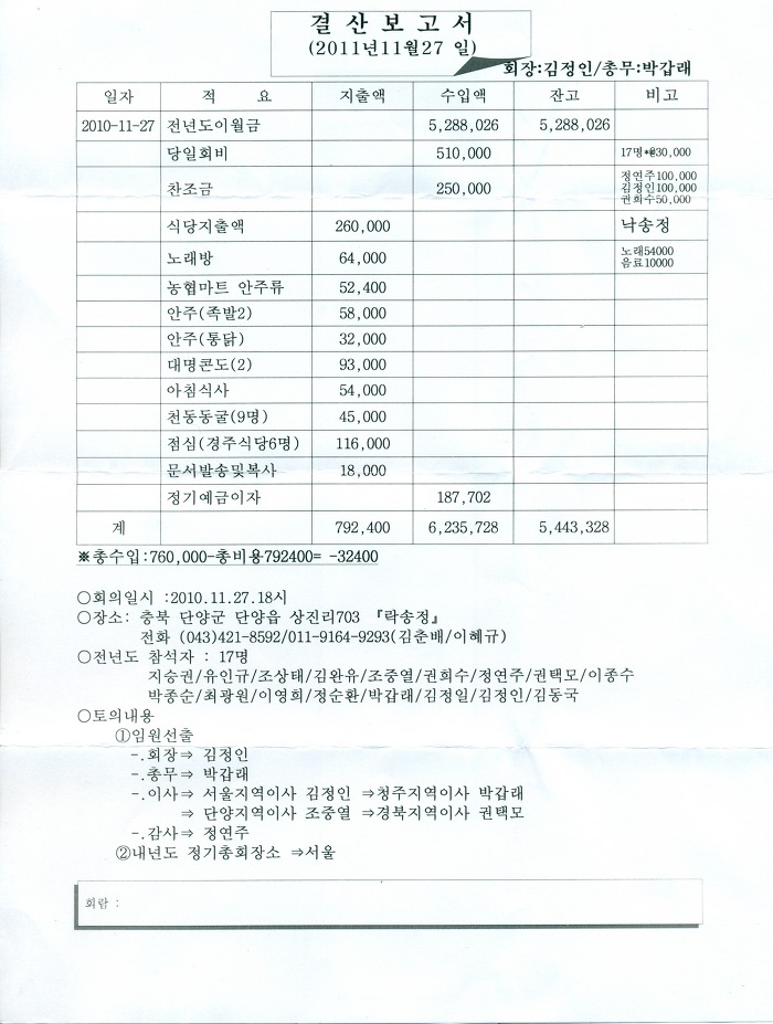 2011년 20기 동창회 결과 보고