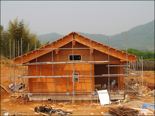지리산 후배는 끝내는 고민을 하다가 기아 모양의 칼라강판으로 지붕마감을 했다. 기와처럼 웅장하거나 기풍 있어 보이지는 않지만 가볍고 방수가 확실하게 되고 수십년 동안 색깔 하나 변하지 않는 칼라강판을 선택할 수밖에 없었다.
