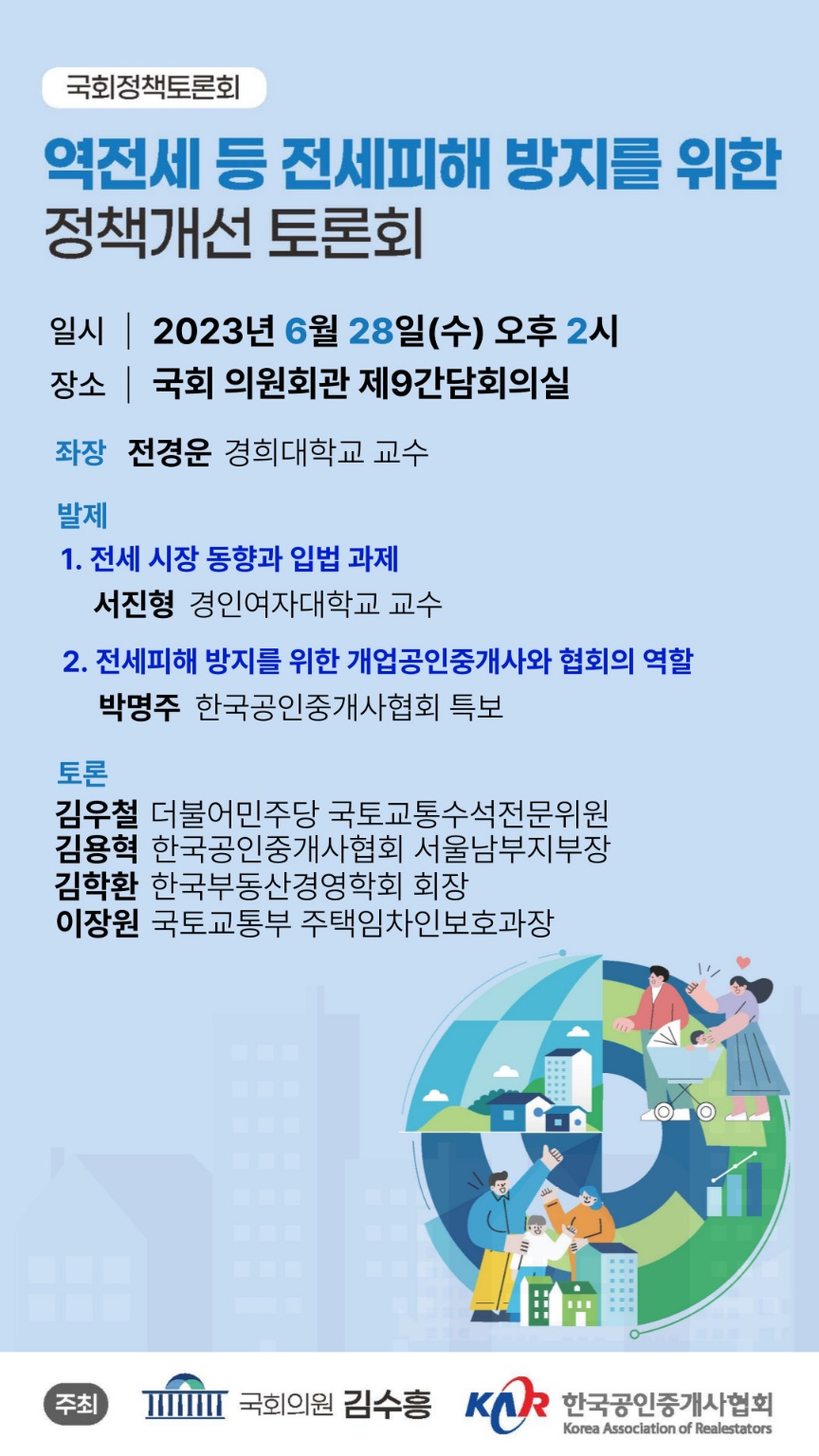 | 역전세 등 전세피해 방지를 위한 정책개선 토론회 개최 최근 집값 하락에 따라 역전세 등 전세피해가 지속되고 올해 하반기에는 더욱 심각해질 것으로 예상되어, 전세피해 방지를 위한 국회와 정부, 공인중개사와 협회의 역할에 대하여 논의하고자 더불어민주당 김수흥 의원과 함께 정책토론회를 개최하오니 많은 참여 부탁드립니다. ◆ 일시 : 2023.06.28.(수) 14:00 ◆ 장소 : 국회 의원회관 제9간담회의실(2층 212호) ◆ 좌장 : 전경운 경희대학교 교수 ◆ 발제 : 서진형 경인여대 교수, 박명주 한국공인중개사협회 특보 ◆ 토론 : 김우철 더불어민주당 국토교통수석전문위원, 김용혁 한국공인중개사협회 서울남부지부장, 김학환 한국부동산경영학회 회장, 이장원 국토교통부 주택임차인보호과장 문의 : 대외협력과(☎044-863-9300) |