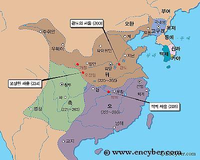 적벽대전(赤壁大戰)은 중국 삼국시대인 208년에 후베이성[湖北省] 자위현[嘉魚縣]의 북동, 양쯔강[揚子江] 남안에 있는 적벽에서 한 전투. 중국 후한(後漢) 말기에 조조(曹操)가 손권(孫權)과 유비(劉備)의 연합군과 싸웠던 전투이다. 원소(袁紹)를 무찌르고 화북(華北)을 평정한 조조는 중국을 통일하려고 약 18만 대군을 이끌고 남하, 적벽에서 손권· 유비 연합군과 대치하였다. 결과 손권의 강남 지배가 확정되고 유비도 형주(荊州:湖南省) 서부에 세력을 얻어 천하 3분의 형세가 확정되었다 (백과사전)