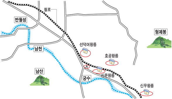 특히 선덕여왕릉 터는 전순을 자르면서 지나고 있으므로, 지금 사천왕사지의 조성은 생기가 없는 땅에 모양만 만드는 형국이다. 또, 서쪽으로 진입하는 철도와 4호선 국도가 선도산(381m) 목자락을 가로질러 조성되어 있으며, 철로는 태종무열왕릉(29대)을 관통하였고 다시 송화산(276m) 자락의 김유신장군(흥무대왕으로 추증)묘를 관통하고 있다. 이곳 역시 흉당으로 바뀌고 있다.