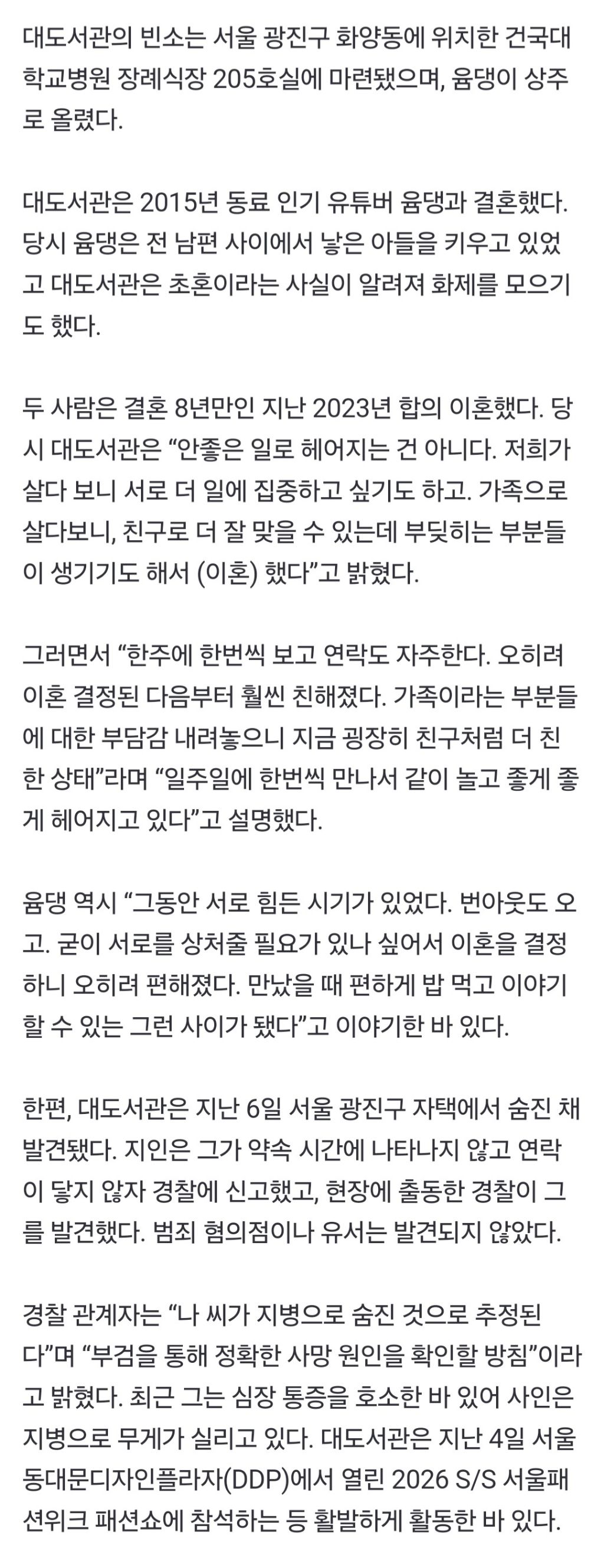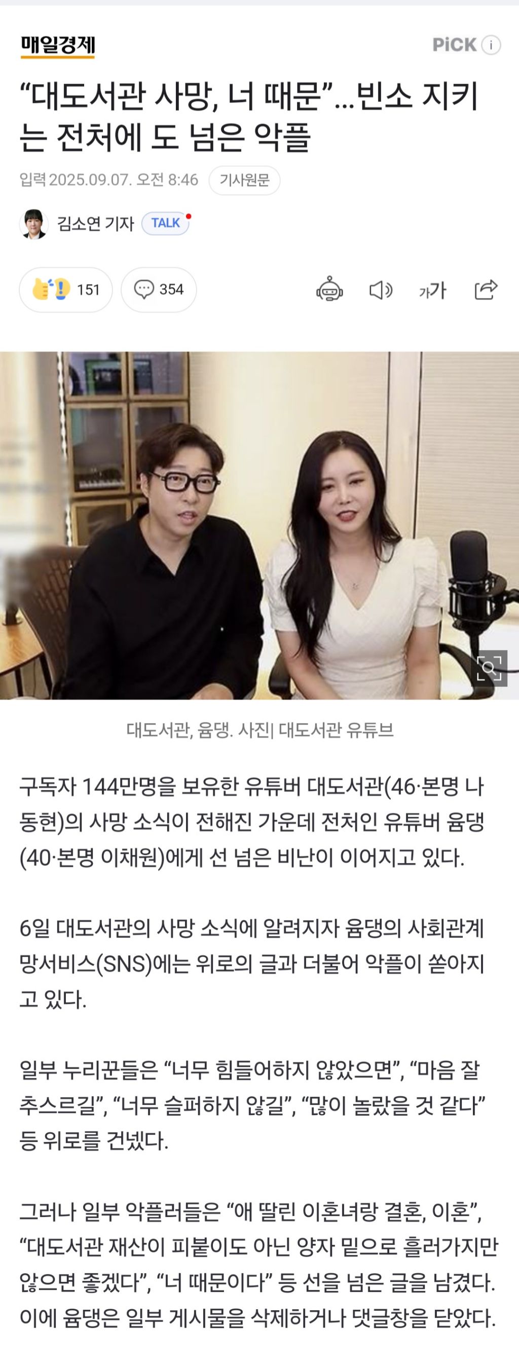 싱글벙글 장수왕 [기사]“대도서관 사망, 너 때문”…빈소 지키는 전처에 도 넘은 악플 작성시간25.09.08|조회수10,673 목록 댓글 11 글자크기 작게가 글자크기 크게가 https://naver.me/ximLDvpW“대도서관 사망, 너 때문”…빈소 지키는 전처에 도 넘은 악플구독자 144만명을 보유한 유튜버 대도서관(46·본명 나동현)의 사망 소식이 전해진 가운데 전처인 유튜버 윰댕(40·본명 이채원)에게 선 넘은 비난이 이어지고 있다. 6일 대도서관의 사망 소식에 알n.news.naver.com 다음검색 현재 게시글 추가 기능 열기 북마크 공유하기 신고 센터로 신고 댓글 11 댓글 리스트 작성시간 25.09.08 정작 둘은 이혼하고도 잘지낸거같던데 왜저래 작성시간 25.09.08 악플 수준 너무 심하던데 고소했으면.. 작성시간 25.09.08 여자패는건 하나의 놀이가된듯 작성시간 25.09.08 금융치료 받았으면 좋겠다. 작성시간 25.09.08 금융치료 하길 카페 방문해 더 많은 댓글 만나기!