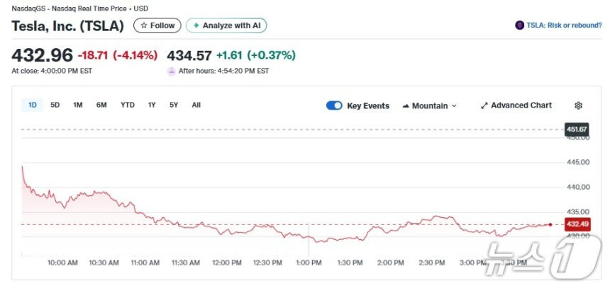 6일(현지 시각) 뉴욕증시에서 테슬라는 4.14% 급락한 432.96달러를 기록했다. 이로써 시총도 1조4400억달러로 줄었다.
