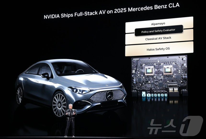 젠슨 황 엔비디아 CEO가 5일(현지시간) 미국 네바다주 라스베이거스 퐁텐블로 호텔에서 열린 엔비디아 CES 2026 라이브에서 기조연설 도중 벤츠와의 협업에 대해 설명하고 있다. (공동취재) 2026.1.6/뉴스1 ⓒ News1 황기선 기자