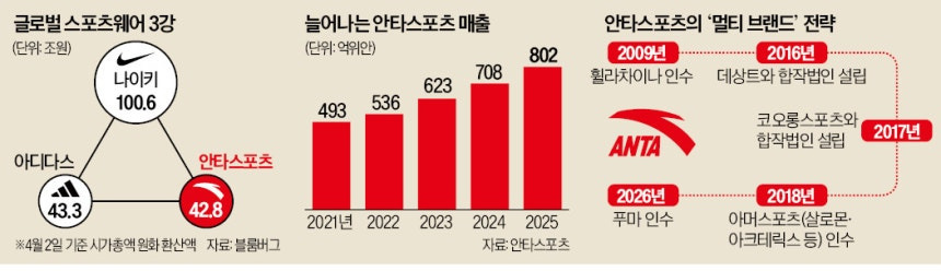 글로벌 패션업체가 되겠다는 딩스종(丁世忠) 안타스포츠 창업자(회장)의 당찬 포부가 점차 현실이 되고 있다. 블룸버그에 따르면 2일 기준 안타스포츠의 시가총액은 2205억1600만홍콩달러(약 42조8000억원)다. 세계 2위 스포츠 의류업체 아디다스(246억600만유로·약 43조3000억원)를 바짝 추격하고 있다. 올해 초 안타스포츠는 푸마 지분 약 29%를 사들여 미국·유럽 포트폴리오를 보완했다. 로이터통신은 “나이키·아디다스와 대등하게 경쟁하는 플레이어”라고 평가했다.