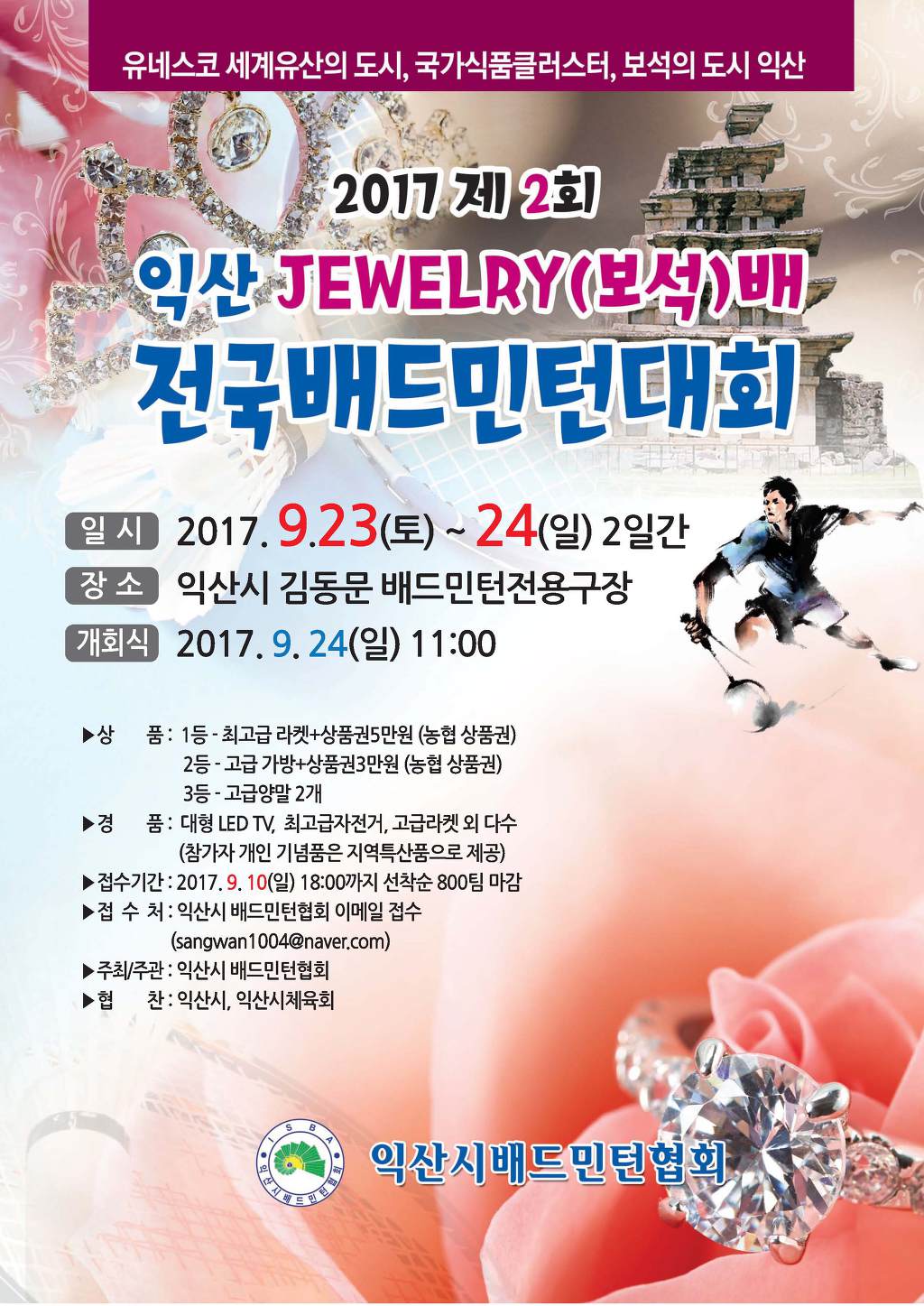 [스크랩] 제2회 익산 JEWELRY(보석)배 전국 배드민턴 대회 작성자도협회 홍보위원장 박현규|작성시간17.08.16|조회수93 목록 댓글 0 글자크기 작게가 글자크기 크게가 제2회 익산쥬얼리배 대회요강.hwp 참가신청서_.xlsx 첨부파일첨부된 파일이 3개 있습니다. jpg 파일 2회보석.jpg 다운로드 xlsx 파일 참가신청서_.xlsx 다운로드 hwp 파일 제2회 익산쥬얼리배 대회요강.hwp 다운로드 다음검색 스크랩 원문 : 익산시 배드민턴 협회 현재 게시글 추가 기능 열기 북마크 공유하기 신고 센터로 신고 댓글 댓글 0 댓글쓰기 답글쓰기 댓글 리스트