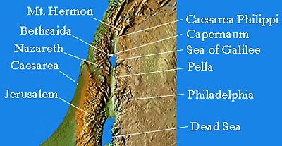 요단강, 갈릴리 호수, 사해바다 요단강은 발원지인 헤르몬산으로부터 사해까지의 직선거리가 대략 130㎞이며, 갈릴리 호수에서 사해까지는 약 96㎞이다. 그러나 강의 전체 길이는 하류의 굴곡 때문에 무려 320㎞가 넘는다. 갈릴리 호수에서 사해까지의 강의 폭은 약 30m, 깊이는 1-3m 정도이다. 초봄에 비가 많이 내리면 강의 폭은 더 넓어지지만, 강 어느 곳에서도 배가 다닐 수 없다. 강폭이 좁고 수심이 낮다보니까 걸어서 건널 수 있는 여울목이 60여 곳이나 된다. 성서시대에는 요단강에 배도 없고 다리도 없었기 때문에 이들 여울목들이 전략상 중요한 위치가 되었을 것은 말할 것도 없다. |