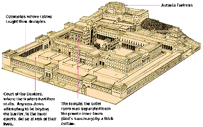 예루살렘 성전도 남쪽(좌측아래)의 건물이 왕실행각이고 동쪽(우측)의 건물이 솔로몬 행각이다. 초대교회가 모인 장소가 바로 솔로몬행각이었다. 서쪽(좌측)의 행각은 랍비들이 그들의 제자들을 가르쳤던 곳이다. 북쪽의 안토니아 요새에는 로마군이 주둔하였고, 총독의 관저도 그곳에 있었다. 행각 안쪽의 마당이 이방인들의 출입이 허락된 뜰이었고, 안쪽의 성전 영내에는 들어갈 수 없었다. 동쪽 성전 영내로 들어가는 입구가 미문이다. 미문안쪽 마당에는 이스라엘 여성들에게 출입이 허락된 곳이었다. 그리고 그 안쪽 성전으로 들어가는 입구가 니가노(Nicanor) 문이며, 입구로 통하는 돌계단이 있었다. 이스라엘 남성들(13세 이상)과 제사장들에게 출입이 허락된 곳이었다. 그러나 이스라엘의 남성들이라도 제사장들 이외에는 번제단이 있는 안쪽 마당으로는 들어갈 수 없었다. 번제단 안쪽에 있는 건물은 성소와 지성소가 있는 건물로 두꺼운 휘장이 두 방을 나누어놓고 있었다. 지성소에는 법궤가 놓여 있었는데, 대제사장이 일년에 한 차례 속제일에만 출입하였다. 성소에는 진설병과 금촛대 그리고 분향단이 놓여있었다.