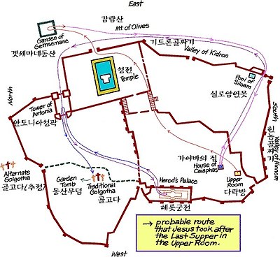 예수께서 체포되어 처형되기까지의 행로 금요일 밤(우리 시간으로는 목요일 밤) 초저녁에 제자들과 함께 유월절 식사를 마치신 예수는 성전 뜰을 지나 겟세마네 동산으로 가신다. 그곳에서 기도하신 후에 체포되어 가야바의 저택으로 끌러와 심문을 받고, 공회의원들 앞에서 또 심문을 받으신다. 새벽녘에 총독 빌라도에게 끌려가 1차 심문을 받고, 이어 헤롯 안디바에게 심문을 받으셨으며, 다시 빌라도에게 보내어져 그곳에서 십자가 형을 언도받고, 채찍에 맞으신 후, 골고다에서 금요일 아침 9시경에 못박히셨다. 이후 6시간 정도를 십자가에 매달려 계셨으며, 오후 3시경 저녁 희생제사를 바치는 바로 그 시간에 운명하셨다. |