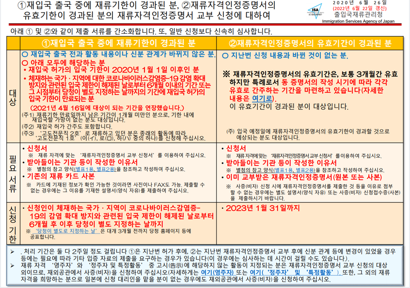 재류자격인정증명서의 유효기간 연장에 대한 안내 작성자동유모강남본사|작성시간22.10.11|조회수198 목록 댓글 0 글자크기 작게가 글자크기 크게가 안녕하세요 ^^ 가을 없이 겨울이 오는 건가요? 날씨가 급 추워졌네요 >< 모두들 감기 조심하셔요. 입국 관리국에서 재류 유효기간 연장에 대한 내용 공유해 드립니다 ^^ 다음의 두 가지 경우에 해당 되는 분들 참고해주세요~!! 1. 재입국 출국 중에 재류기한이 경과 된 분 2. 재류자격인정증명서의 유효기한이 경과된 분 각각의 내용 잘 참고해주세요~!! 카카오톡 실시간 상담 서비스 다음검색 현재 게시글 추가 기능 열기 북마크 공유하기 신고 센터로 신고 댓글 댓글 0 댓글쓰기 답글쓰기 댓글 리스트
