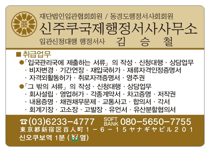 사무소명: 신주쿠국제행정서사사무소(新宿国際行政書士事務所)