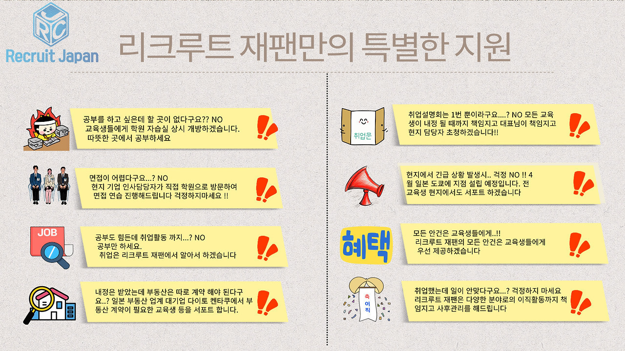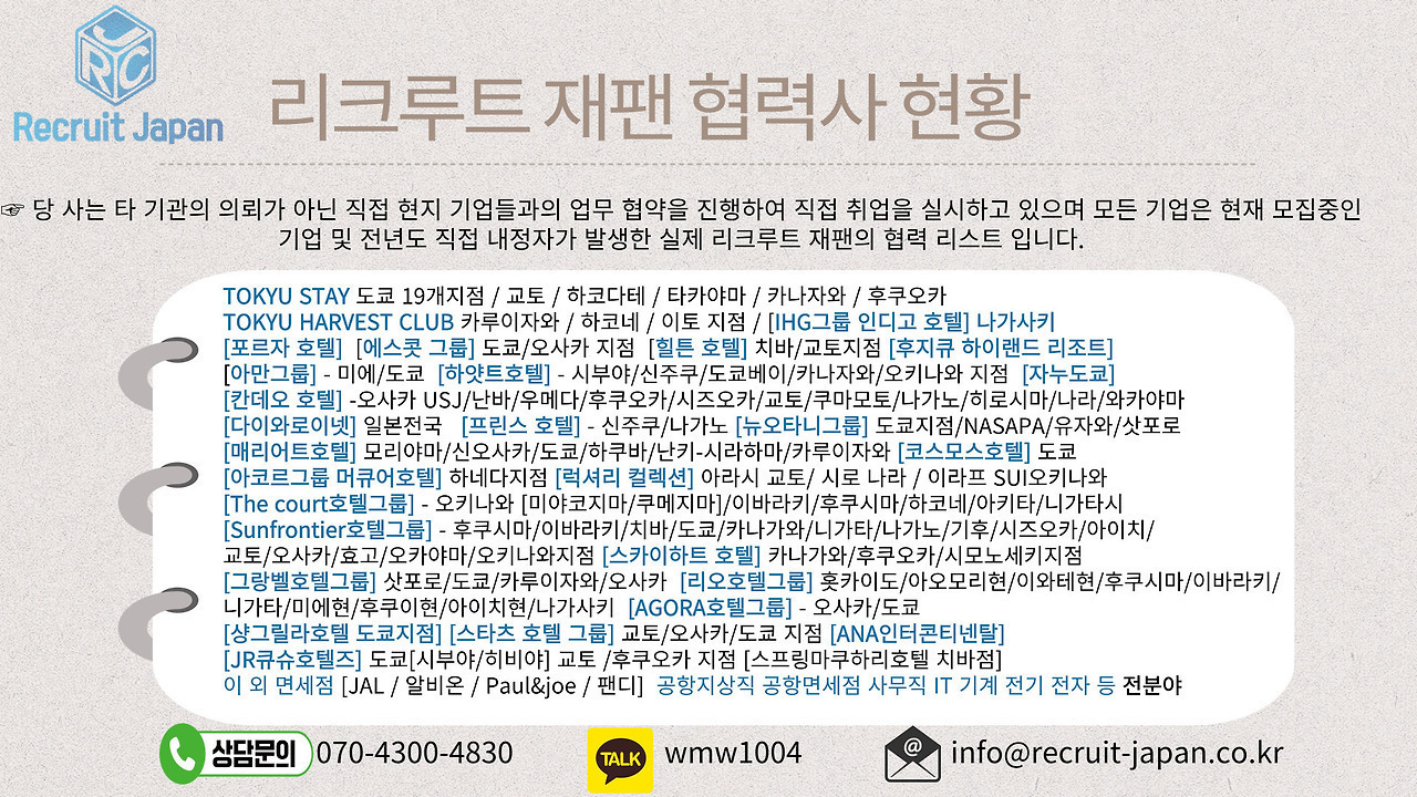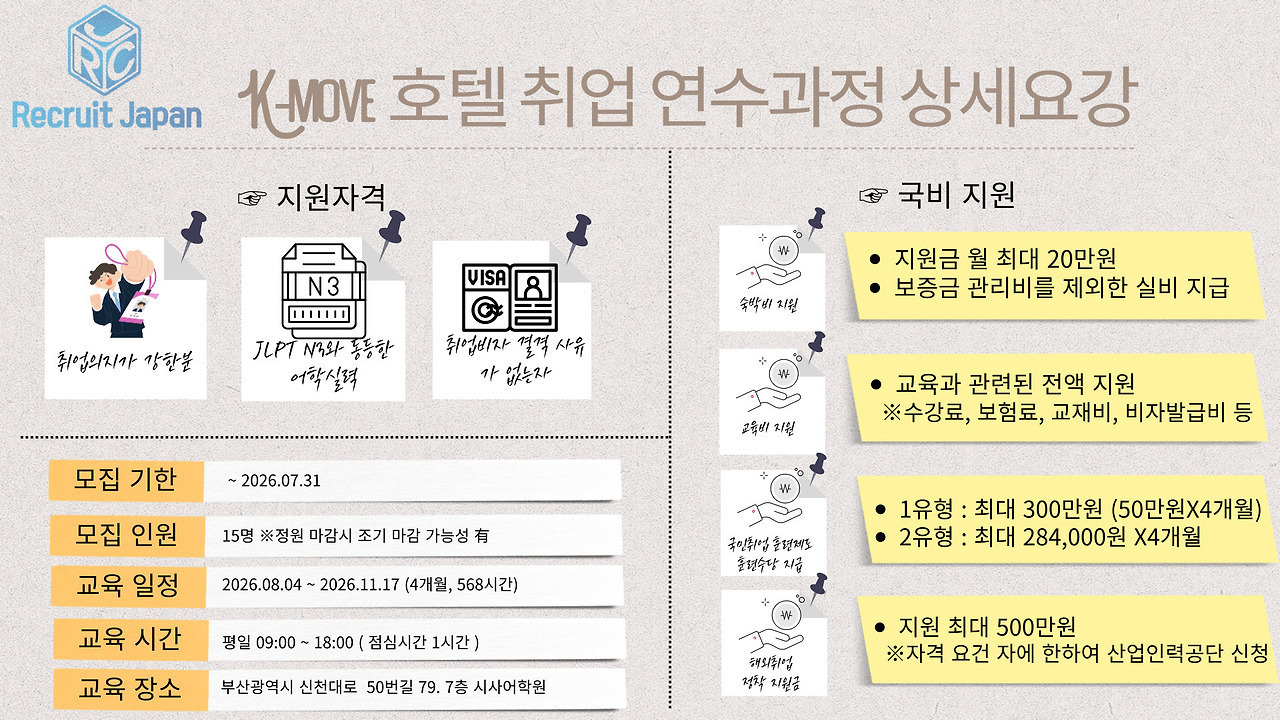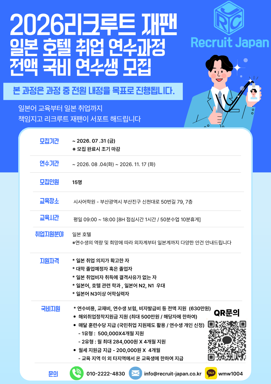 | 2026년 일본 호텔 취업 연수과정 (부산) 참가자 모집 안녕하세요. 리크루트재팬입니다. 2026년 일본 호텔 취업 연수과정을 올해는 부산에서 진행하게 되었습니다. 리크루트재팬은 교육보다 취업에 강점을 가진 해외취업 전문 기업으로, 교육생 여러분의 취업 내정을 목표로 전문적인 취업 지원을 진행하고 있습니다. 교육은 교육 전문기관인 시사일본어학원과 함께 진행하며, 리크루트재팬은 취업 매칭, 면접 준비, 진로 상담, 내정 이후 사후관리까지 취업 전반에 걸친 밀착 지원 시스템을 운영하고 있습니다. 실제 취업 중심 운영과 현지 기업 네트워크를 바탕으로 교육생 개개인의 상황에 맞는 취업 매칭을 진행하고 있습니다. 실제 취업 중심 운영과 현지 기업 네트워크를 바탕으로 교육생 개개인의 상황에 맞는 취업 매칭을 진행하고 있습니다. 또한 리크루트재팬은 일본 도쿄 현지에도 지사를 운영하고 있어, 교육 종료 후 취업으로 모든 과정이 끝나는 것이 아니라 현지 근무 적응, 생활 상담, 직장 내 문제 대응, 이직 및 커리어 관리 등 취업 이후의 상황까지 전적으로 지원하고 있습니다. 해외 취업은 취업 그 자체보다 현지에서의 안정적인 정착과 지속적인 커리어 관리가 매우 중요합니다. 리크루트재팬은 여러분이 일본에서 안정적으로 근무할 수 있도록 끝까지 함께하는 파트너가 되겠습니다. 담당자가 정기적으로 학원을 방문하여 취업 상담 진로 방향 설정 기업 매칭 및 면접 준비 내정 이후 근무 관련 상담 이직 및 커리어 상담 등 교육생의 취업과 관련된 모든 과정을 책임지고 적극적으로 서포트할 예정입니다. 하루 8시간의 집중 교육 과정으로 쉽지 않은 시간이 될 수 있지만, 이 시간을 통해 교육과 취업이라는 두 가지 목표를 반드시 달성할 수 있도록 리크루트재팬이 끝까지 함께 하겠습니다. 해외취업을 진지하게 준비하고 있는 분들의 많은 지원 바랍니다. ■ 응시자격 - 대한민국 국민으로 만 34세 이하로 해외취업에 결격 사유가 없는 자 - 취업비자 발급에 결격 사유가 없는자 - 대학 졸업자 혹은 연수종료시기 졸업예정자 - 해외취업에 대한 의지가 강한 자 - 연수개시일 기준 1년 이내 산업인력공단의 연수과정이나 해외인턴과정에 참가한 이력이 없는 자 - 연수개시일 기준 고용 보험 가입 및 개인사업자 등록중이 아니한 자 ■ 선발과정 우대사항 - 지방 거주자 또는 지방소재 대학 졸업자 - 호텔 관련 직무 경력 혹은 서비스 직종 근무 경력 소지자 - 일본 현지 워킹 홀리데이 혹은 어학 연수 경험자 - 일본어 및 호텔 등 본 과정과 연관성있는 관력 학과 졸업자 - 국민기초생활보장법에 따른 수급자 |