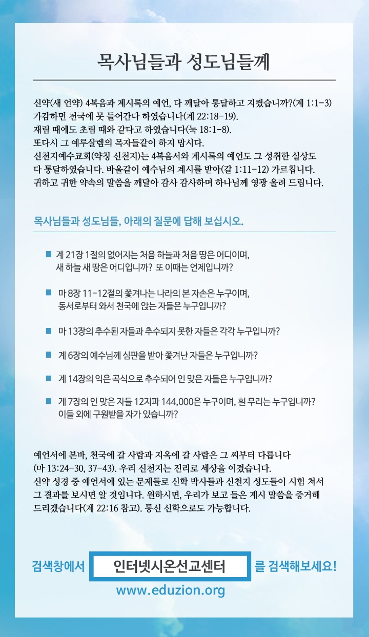 꼭 알아야할 정보글.jpg 작성자ㄹㄹ|작성시간19.12.07|조회수18 목록 댓글 0 글자크기 작게가 글자크기 크게가 동영상[신천지, 한기총 교리비교 1] 계 8장의 '배들 삼분의일이 깨어지는 것'의 참 의미는?[신천지, 한기총 교리비교 1] 계 8장의 '배들 삼분의일이 깨어지는 것'의 참 의미는?요한계시록 8장에 나오는 '배들 삼분의일이 깨어지는 것'의 참 의미는 무엇일까요?믿음의 본질은 하나님의 약속을 믿는 것입니다. 약속을 믿는 다는 것은 성경에 기록된 하나님의 약속과 이루어진 것(실상)을 믿는 것입니다. 말씀은 폐하지 않고 하나님께서 다 이루십니다.(요10:35, 마5:18, 사14:24) 그렇기에 성경에 다른 복음을 전하면 천사라도 저주를www.youtube.com http://scj.so/movie200 다음검색 현재 게시글 추가 기능 열기 북마크 공유하기 신고 센터로 신고 댓글 댓글 0 댓글쓰기 답글쓰기 댓글 리스트