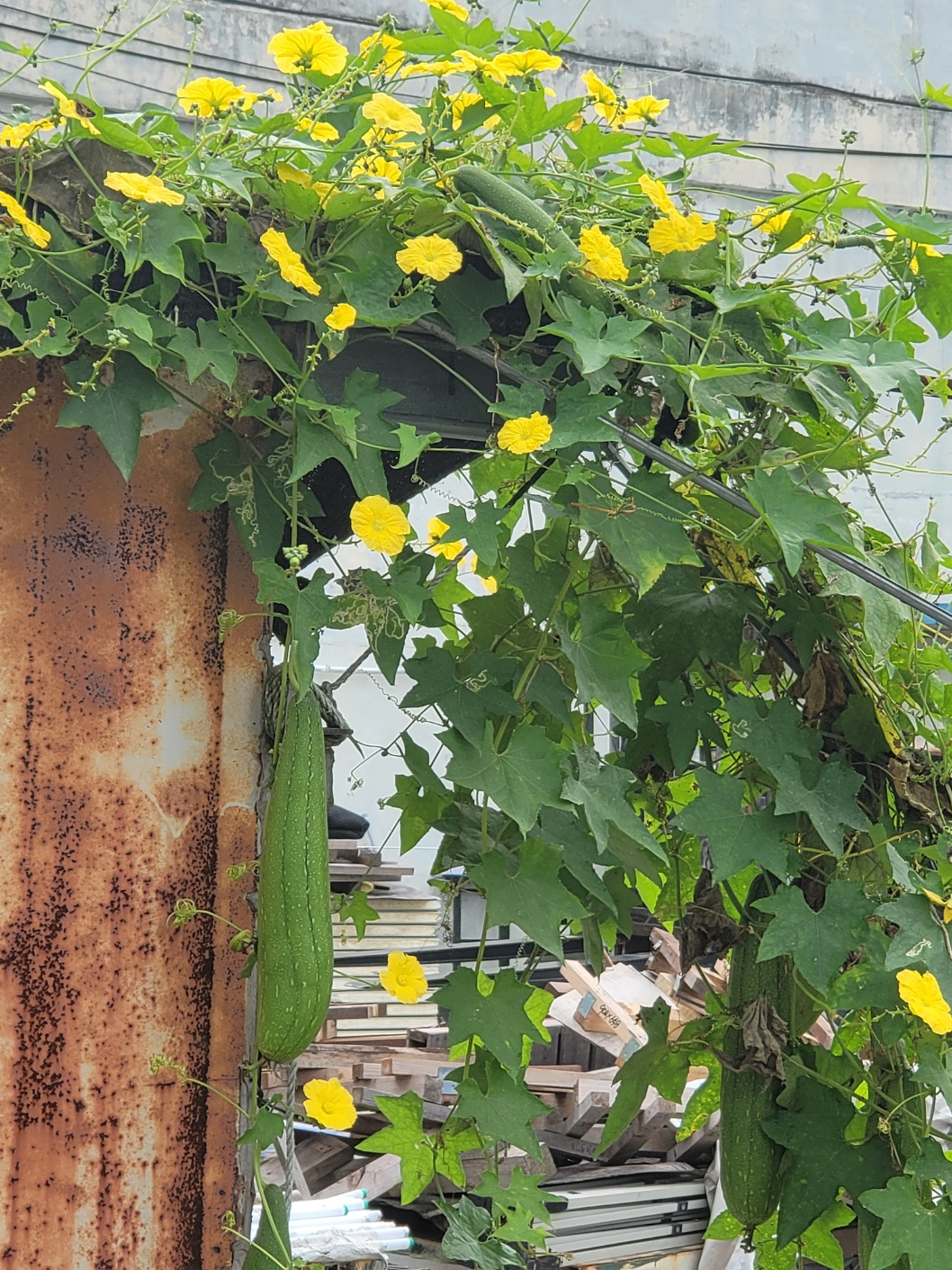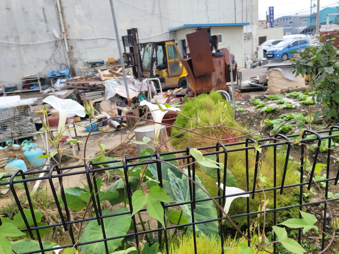 그리고 차를 정비하는 시간에 인근 담벼락에 난 꽃들을 찍었다. 주먹만한 수박도 발견했고, 수세미, 고추도 있었다. 특히 코스모스는 정말 오랜만이다.
