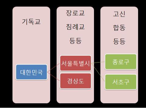 또한 서울특별시('장로교'라고 한다면..)안에는 또 여러 구역으로 구분되어있어. 예로들면 종로구, 강남구,서초구 등등(고신, 합동,통합 등등)..