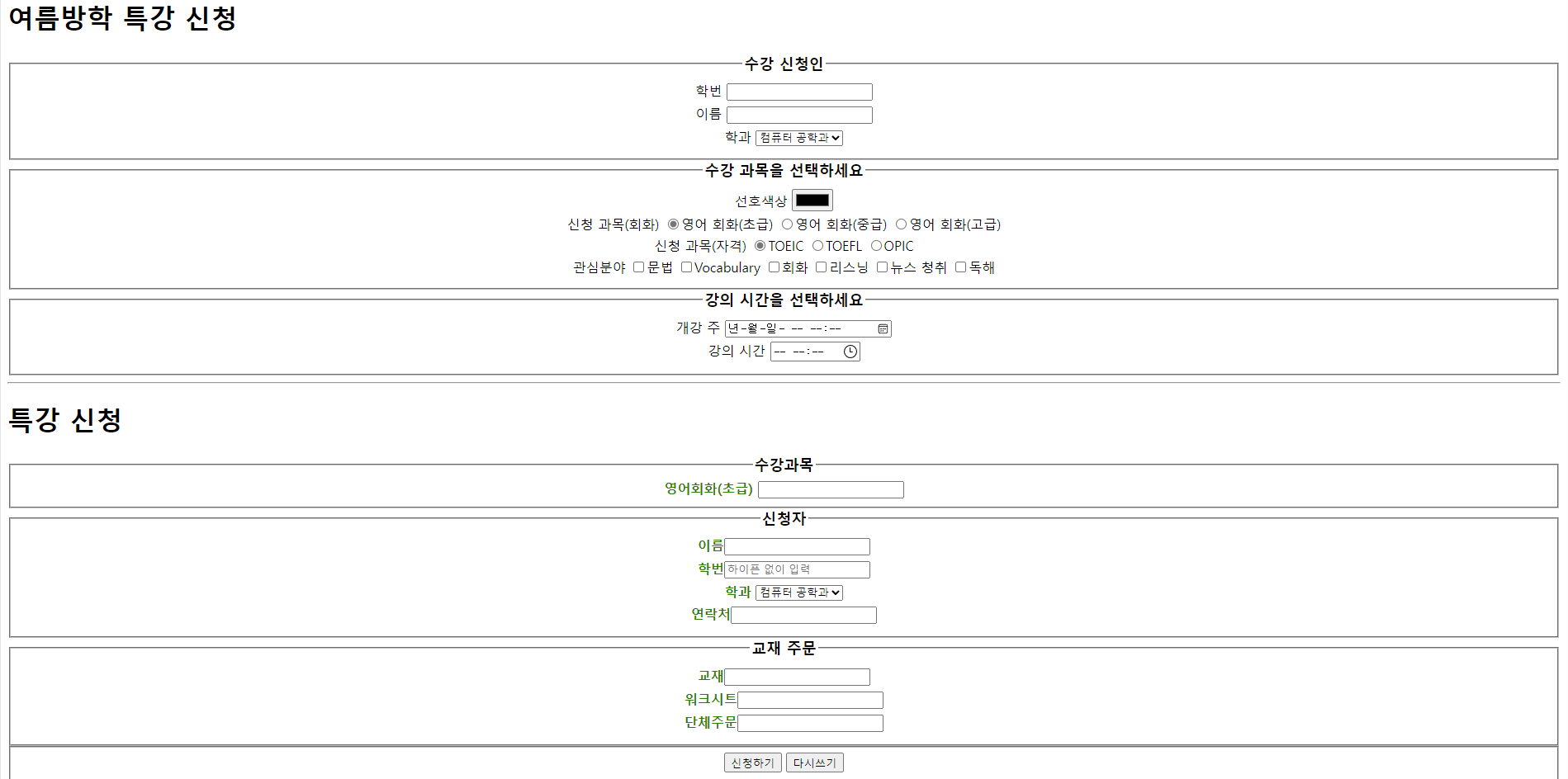 1 2 3 4 5 6 7 8 9 10 11 12 13 14 15 16 17 18 19 20 21 22 23 24 25 26 27 28 29 30 31 32 33 34 35 36 37 38 39 40 41 42 43 44 45 46 47 48 49 50 51 52 53 54 55 56 57 58 59 60 61 62 63 64 65 66 67 68 69 70 71 72 73 74 75 76 77 78 79 80 81 82 83 84 85 86 87 88 89 90 91 92 93 94 | <!DOCTYPE html> <html lang="en"> <head> <meta charset="UTF-8"> <meta name="viewport" content="width=device-width, initial-scale=1.0"> <title>vacation.html</title> <style> div { margin: 5px; } </style> </head> <body> <form> <h1>여름방학 특강 신청</h1> <fieldset align="center"> <legend><font size ="4"><strong>수강 신청인</strong></font></legend> <div>학번 <input type="number" /></div> <div>이름 <input type="text" ></div> <div> 학과 <select name="major" id="major"> <option selected>컴퓨터 공학과</option> <option>국문학과</option> <option>물리학과</option> <option>기타</option> </select> </div> </fieldset> <fieldset align="center"> <legend ><font size ="4"><strong>수강 과목을 선택하세요</strong></font></legend> <div>선호색상 <input type="color" /></div> <div> 신청 과목(회화) <label for="e1"><input type="radio" id="e1" name="eng1" checked>영어 회화(초급)</label> <label for="e2"><input type="radio" id="e2" name="eng1">영어 회화(중급)</label> <label for="e3"><input type="radio" id="e3" name="eng1">영어 회화(고급)</label> </div> <div> 신청 과목(자격) <label for="e11"><input type="radio" id="e11" name="eng2" checked>TOEIC</label> <label for="e12"><input type="radio" id="e12" name="eng2">TOEFL</label> <label for="e13"><input type="radio" id="e13" name="eng2">OPIC</label> </div> <div> 관심분야 <label for="gram"><input type="checkbox" name="subject" id="gram">문법</label> <label for="voca"><input type="checkbox" name="subject" id="voca">Vocabulary</label> <label for="con"><input type="checkbox" name="subject" id="con">회화</label> <label for="lis"><input type="checkbox" name="subject" id="lis">리스닝</label> <label for="news"><input type="checkbox" name="subject" id="news">뉴스 청취</label> <label for="read"><input type="checkbox" name="subject" id="read">독해</label> </div> </fieldset> <fieldset align="center"> <legend><font size ="4"><strong>강의 시간을 선택하세요</strong></font></legend> <div>개강 주 <input type="datetime-local"></div> <div>강의 시간 <input type="time"></div> </fieldset> <hr /> <h1>특강 신청</h1> <fieldset align="center"> <legend><font size ="4"><strong>수강과목</strong></font></legend> <font color = "green"><strong>영어회화(초급)</strong></font> <input type="datetime"> </fieldset> <fieldset align="center"> <legend><font size ="4"><strong>신청자</strong></font></legend> <div><font color = "green"><strong>이름</strong></font><input type="datetime"></div> <div><font color = "green"><strong>학번</strong></font><input type="number" placeholder="하이픈 없이 입력"></div> <div> <font color = "green"><strong>학과</strong></font> <select name="major" id="major"> <option selected>컴퓨터 공학과</option> <option>국문학과</option> <option>물리학과</option> <option>기타</option> </select> </div> <div><font color = "green"><strong>연락처</strong></font><input type="tel"></div> </fieldset> <fieldset align="center"> <legend><font size ="4"><strong>교재 주문</strong></font></legend> <div><font color = "green"><strong>교재</strong></font><input type="number" /></div> <div><font color = "green"><strong>워크시트</strong></font><input type="number" /></div> <div><font color = "green"><strong>단체주문</strong></font><input type="number" /></div> </fieldset> <fieldset align="center"> <input type="submit" value="신청하기"> <input type="reset" value="다시쓰기"> </fieldset> </form> </body> </html> | cs |