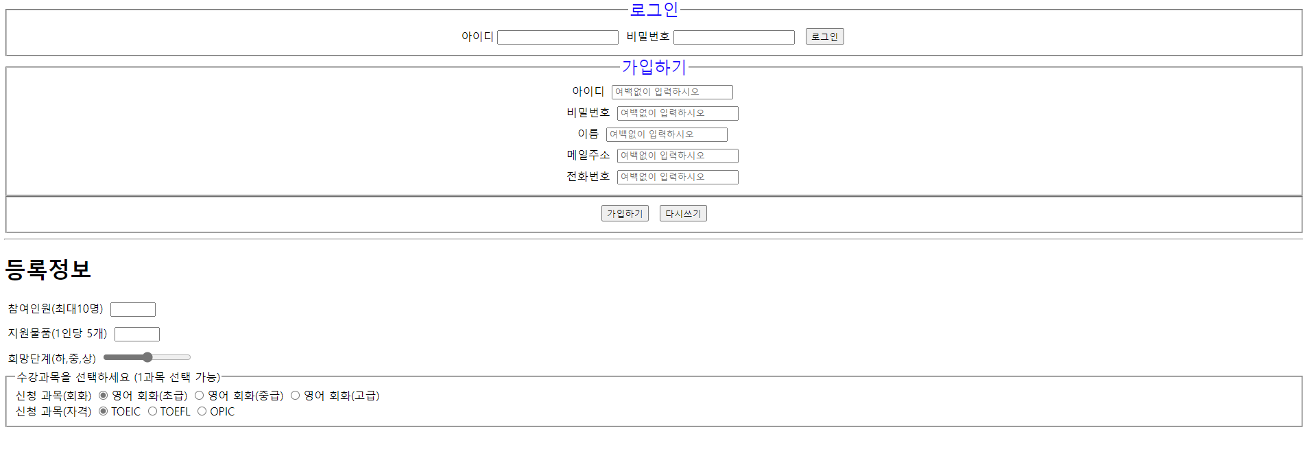 1 2 3 4 5 6 7 8 9 10 11 12 13 14 15 16 17 18 19 20 21 22 23 24 25 26 27 28 29 30 31 32 33 34 35 36 37 38 39 40 41 42 43 44 45 46 47 48 49 50 51 52 53 54 55 56 57 58 59 60 61 | <!DOCTYPE html> <html lang="en"> <head> <meta charset="UTF-8"> <meta name="viewport" content="width=device-width, initial-scale=1.0"> <title>login.html</title> <style> input { margin: 5px; } div { margin: 5px; } </style> </head> <body> <form> <fieldset align="center"> <legend><font size="5" color="blue">로그인</font></legend> 아이디<input type="text" autofocus> 비밀번호<input type="password"> <input type="submit" value="로그인"> </fieldset> <fieldset align="center"> <legend><font size="5" color="blue">가입하기</font></legend> 아이디 <input type="text" required placeholder="여백없이 입력하시오"><br /> 비밀번호 <input type="password" required placeholder="여백없이 입력하시오"><br /> 이름 <input type="text" required placeholder="여백없이 입력하시오"><br /> 메일주소 <input type="email" required placeholder="여백없이 입력하시오"><br /> 전화번호 <input type="tel" placeholder="여백없이 입력하시오"><br /> </fieldset> <fieldset align="center"> <label><input type="submit" value="가입하기"></label> <label><input type="reset" value="다시쓰기"></label> </fieldset> <hr /> <h1 align="left">등록정보</h1> <div> 참여인원(최대10명) <input type="number" max="10" min="0" /> </div> <div> 지원물품(1인당 5개) <input type="number" max="25" min="0" /> </div> <div> 희망단계(하,중,상) <input type="range" max="2"/> </div> <fieldset> <legend>수강과목을 선택하세요 (1과목 선택 가능)</legend> 신청 과목(회화) <label for="e1"><input type="radio" id="e1" name="eng1" checked>영어 회화(초급)</label> <label for="e2"><input type="radio" id="e2" name="eng1">영어 회화(중급)</label> <label for="e3"><input type="radio" id="e3" name="eng1">영어 회화(고급)</label> <br /> 신청 과목(자격) <label for="e11"><input type="radio" id="e11" name="eng2" checked>TOEIC</label> <label for="e12"><input type="radio" id="e12" name="eng2">TOEFL</label> <label for="e13"><input type="radio" id="e13" name="eng2">OPIC</label> </fieldset> </form> </body> </html> | cs |