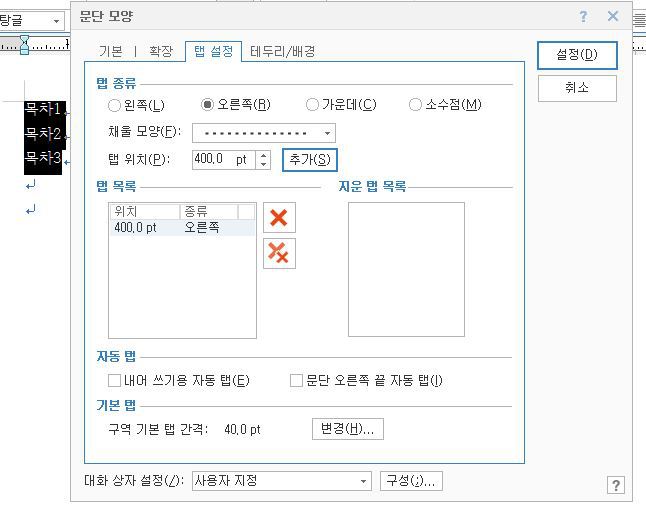 4. 탭위치에서 점선의 크기를 선택한다(보통 400-450정도)