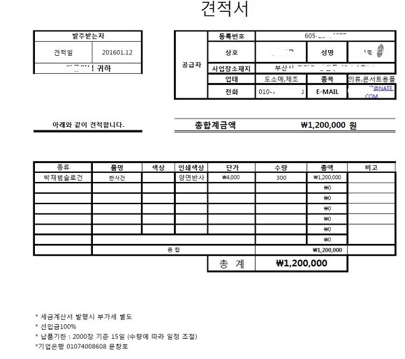 영수증은 받지 않아 견적서로 대신합니다.