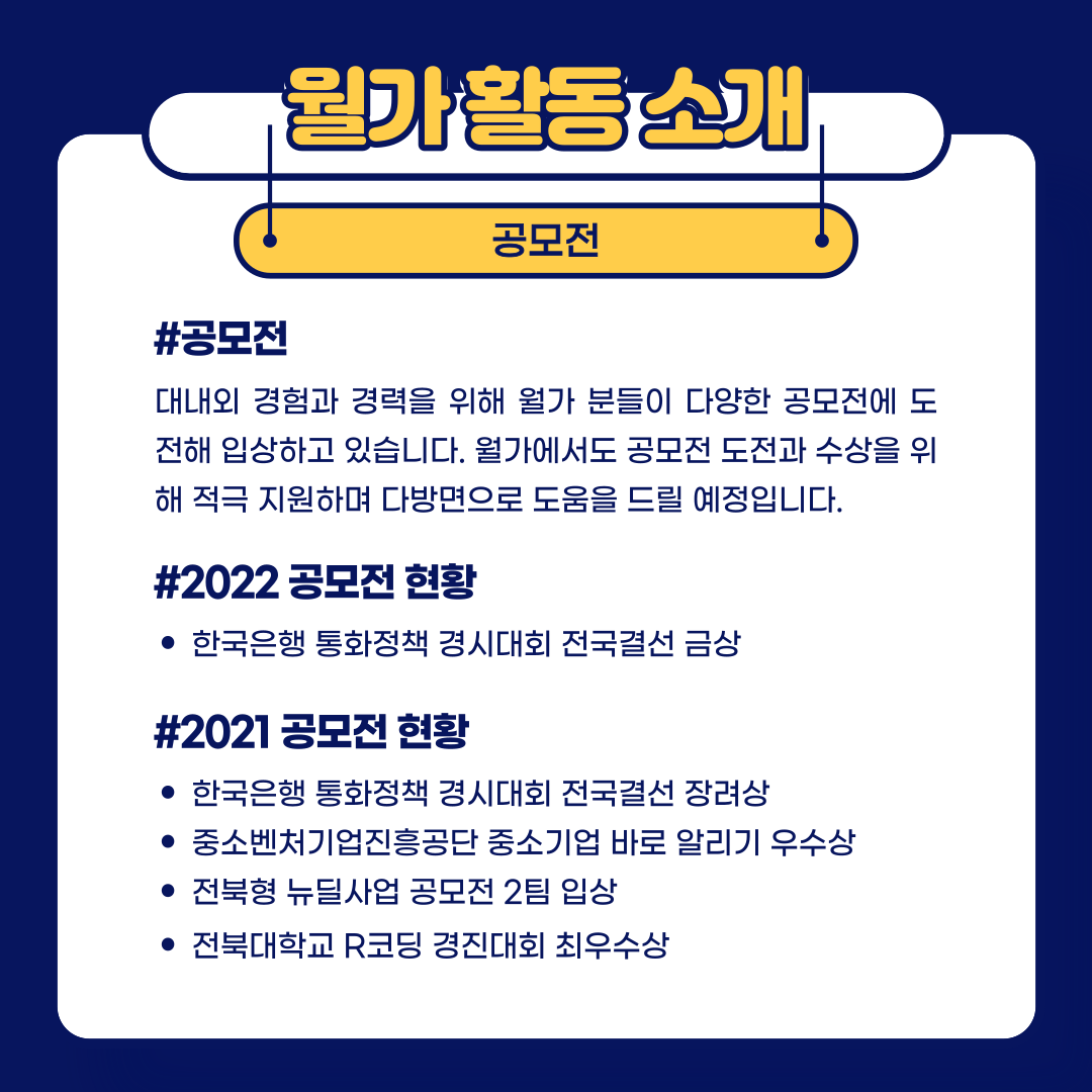 5) 공모전 – 한국은행 통화정책 경시대회, 파생상품 경시대회, R코딩 경진대회, 전북형 뉴딜산업 공모전, 금융감독원 공모전, 중소벤처기업진흥공단 공모전 등 참여하고 싶은 회원들끼리 모여 스터디를 형성 후 공모전에 참여하고 있습니다.