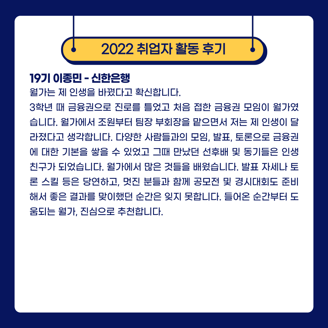 전북대학교 금융권 취업동아리 ‘월가’는 자유롭고 수평적인 분위기의 취업동아리입니다. ‘월가’는 세계적인 금융 중심지 Wall street에서 따온 이름으로 한국 최고의 금융권 인재, 나아가서는 전 세계를 무대로 활동하는 금융권 인재가 되기 위해 노력하자는 의미를 담고 있습니다.