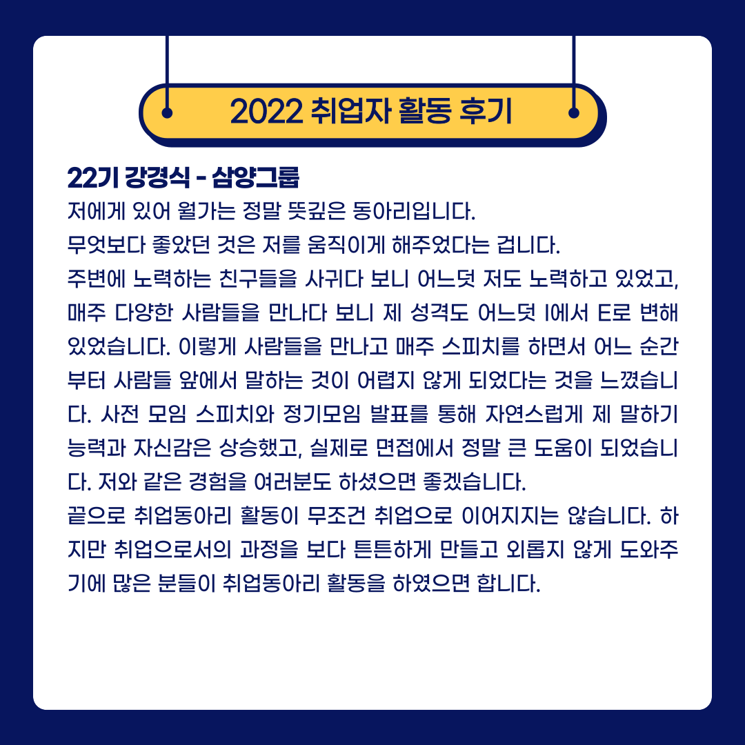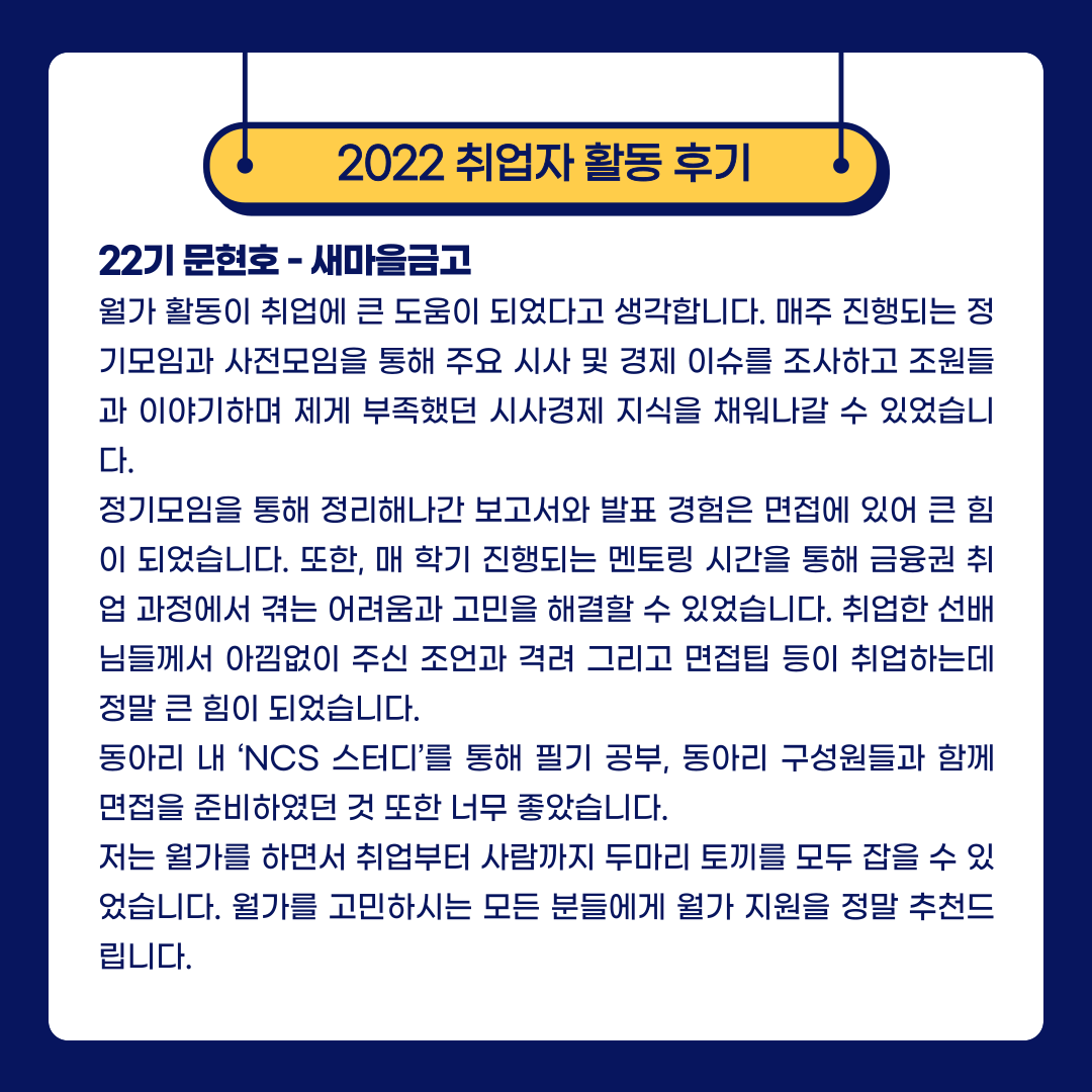 2) 활동기수와 취업기수 간 멘토링은 은행 · 증권 · 보험 · 공기업 · 금융권, 사기업 등 취업하신 선배님과의 만남으로 취업, 직무, 기업관련 멘토링을 진행합니다.